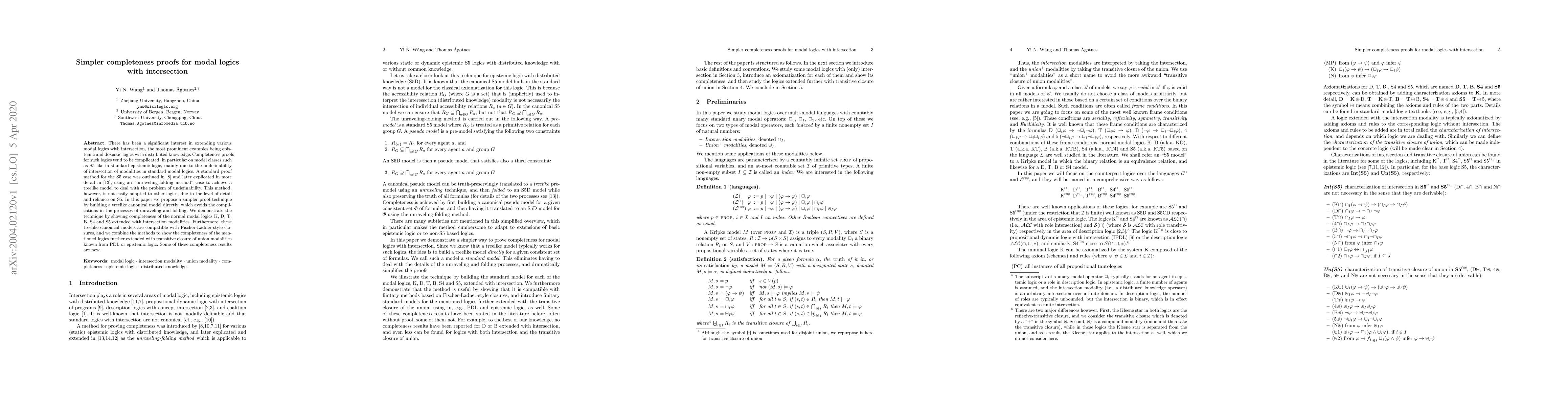This paper proposes a simpler completeness proof technique for modal logics extended with intersection, using a treelike canonical model to avoid the complexities of unraveling and folding. The method is demonstrated for normal modal logics K, D, T, B, S4, and S5, and extended to include transitive closure of union modalities, yielding new completeness results.