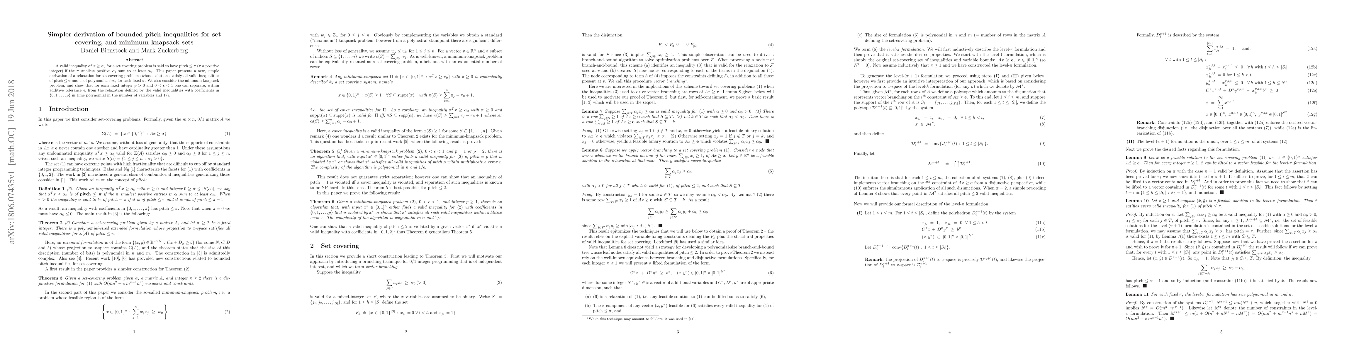 A valid inequality \alpha^Tx \ge \alpha_0 for a set covering problem is said to have pitch <= k ( a positive integer) if the k smallest positive \alpha_j sum to at least alpha_0. This paper presents a new, simple derivation of a relaxation for set covering problems whose solutions satisfy all valid inequalities of pitch and is of polynomial size, for each fixed . We also consider the minimum knapsack problem, and show that for each fixed integer p > 0 and 0 < \epsilon < 1 one can separate, within additive tolerance \epsilon, from the relaxation defined by the valid inequalities with coefficients in {0, 1, . . . , p} in time polynomial in the number of variables and 1/\epsilon.