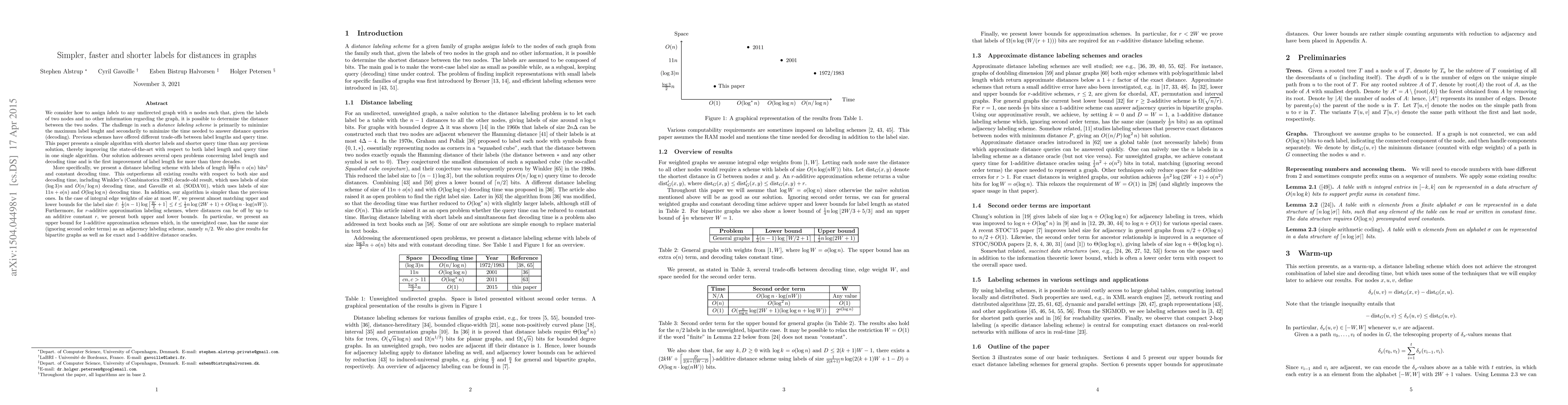 This research introduces a novel distance labeling algorithm for undirected graphs, significantly reducing label size to (log 3)/2 + o(n) and ensuring constant O(1) query time, surpassing previous methods in both aspects. The algorithm also offers simpler design and addresses long-standing problems in label length and decoding time, with additional results for weighted, bipartite graphs, and approximation schemes.