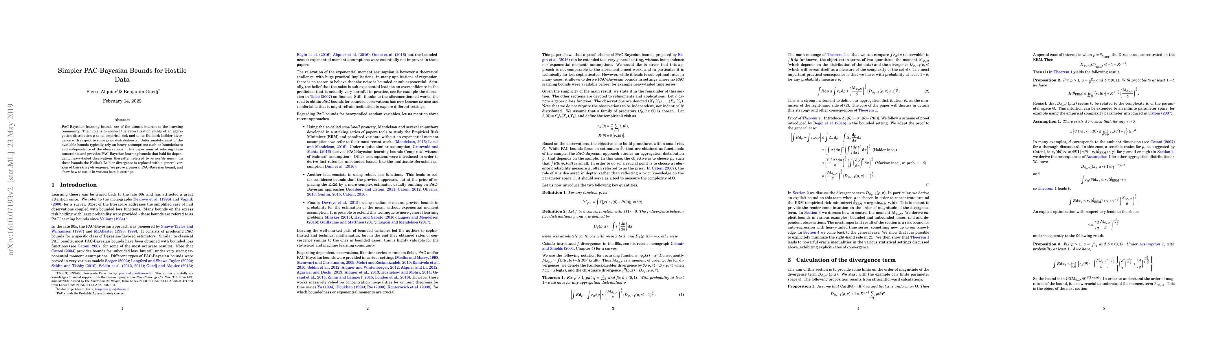 PAC-Bayesian learning bounds are of the utmost interest to the learning community. Their role is to connect the generalization ability of an aggregation distribution $\rho$ to its empirical risk and to its Kullback-Leibler divergence with respect to some prior distribution $\pi$. Unfortunately, most of the available bounds typically rely on heavy assumptions such as boundedness and independence of the observations. This paper aims at relaxing these constraints and provides PAC-Bayesian learning bounds that hold for dependent, heavy-tailed observations (hereafter referred to as \emph{hostile data}). In these bounds the Kullack-Leibler divergence is replaced with a general version of Csisz\'ar's $f$-divergence. We prove a general PAC-Bayesian bound, and show how to use it in various hostile settings.