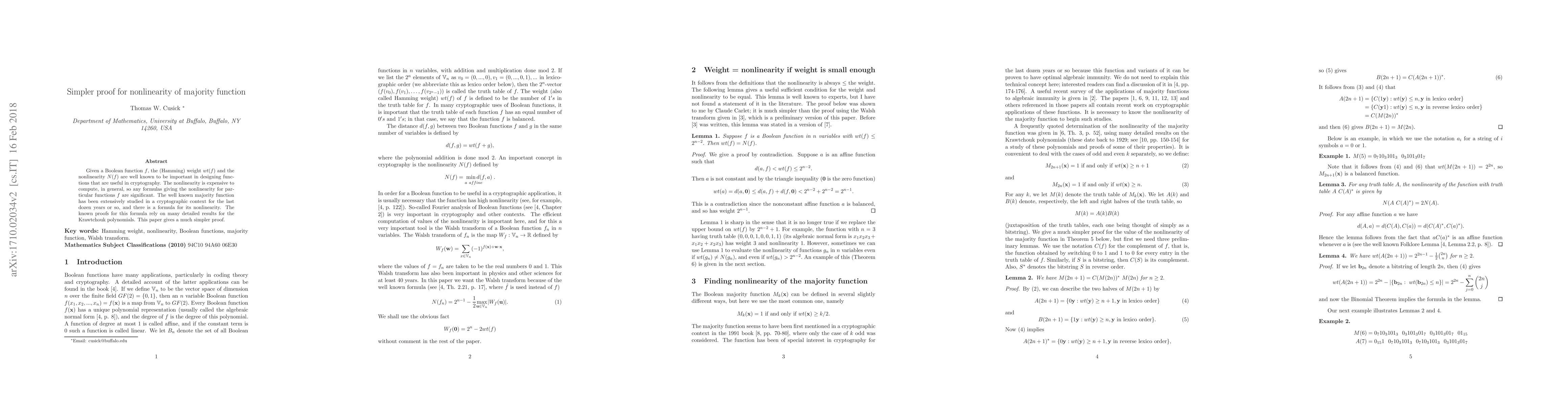 Given a Boolean function f, the (Hamming) weight wt(f) and the nonlinearity N(f) are well known to be important in designing functions that are useful in cryptography. The nonlinearity is expensive to compute, in general, so any shortcuts for doing that for particular functions f are significant. The well known majority function has been extensively studied in a cryptographic context for the last dozen years or so, and there is a formula for its nonlinearity. The known proofs for this formula rely on many detailed results for the Krawtchouk polynomials. This paper gives a much simpler proof.