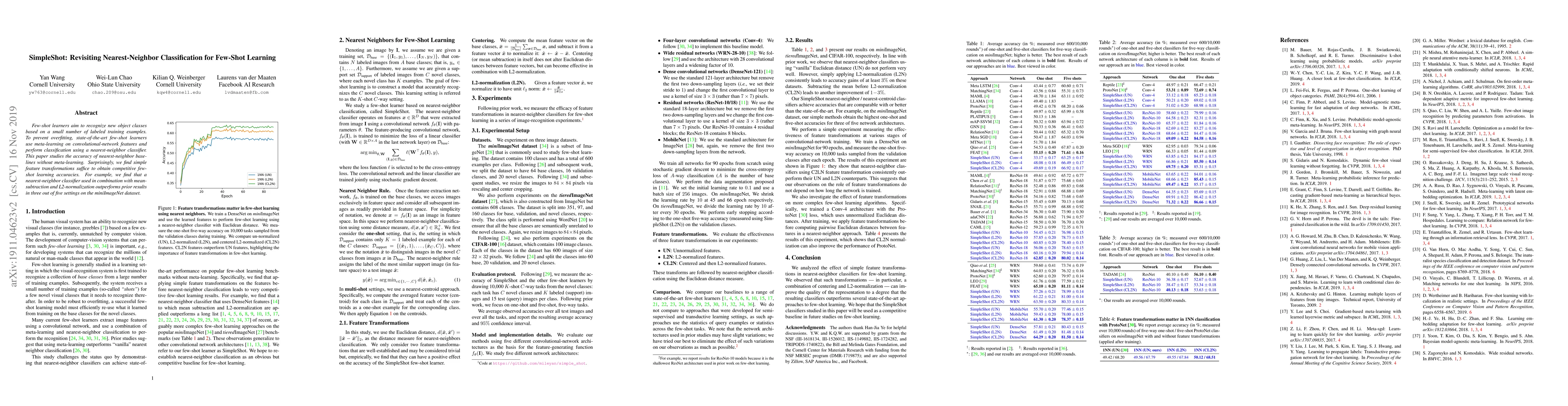 Title: SimpleShot: Revisiting Nearest-Neighbor Classification for Few-Shot Learning Summary: This paper explores the effectiveness of nearest-neighbor classification without meta-learning for few-shot learning, finding that simple feature transformations like mean-subtraction and L2-normalization can achieve competitive accuracies, outperforming prior results in several settings.