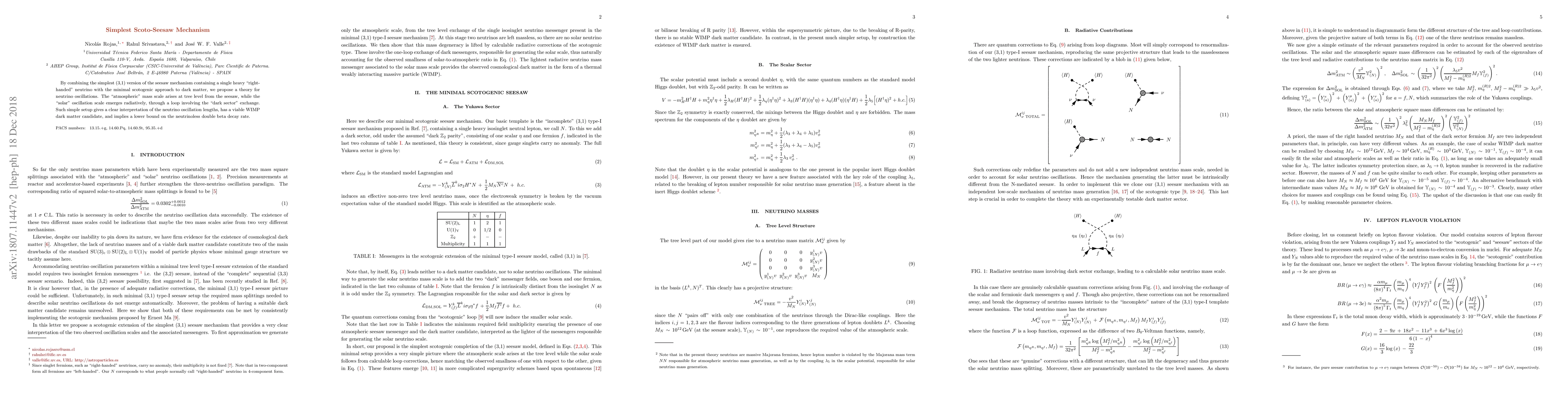 By combining the simplest (3,1) version of the seesaw mechanism containing a single heavy "right-handed" neutrino with the minimal scotogenic approach to dark matter, we propose a theory for neutrino oscillations. The "atmospheric" mass scale arises at tree level from the seesaw, while the "solar" oscillation scale emerges radiatively, through a loop involving the "dark sector" exchange. Such simple setup gives a clear interpretation of the neutrino oscillation lengths, has a viable WIMP dark matter candidate, and implies a lower bound on the neutrinoless double beta decay rate.