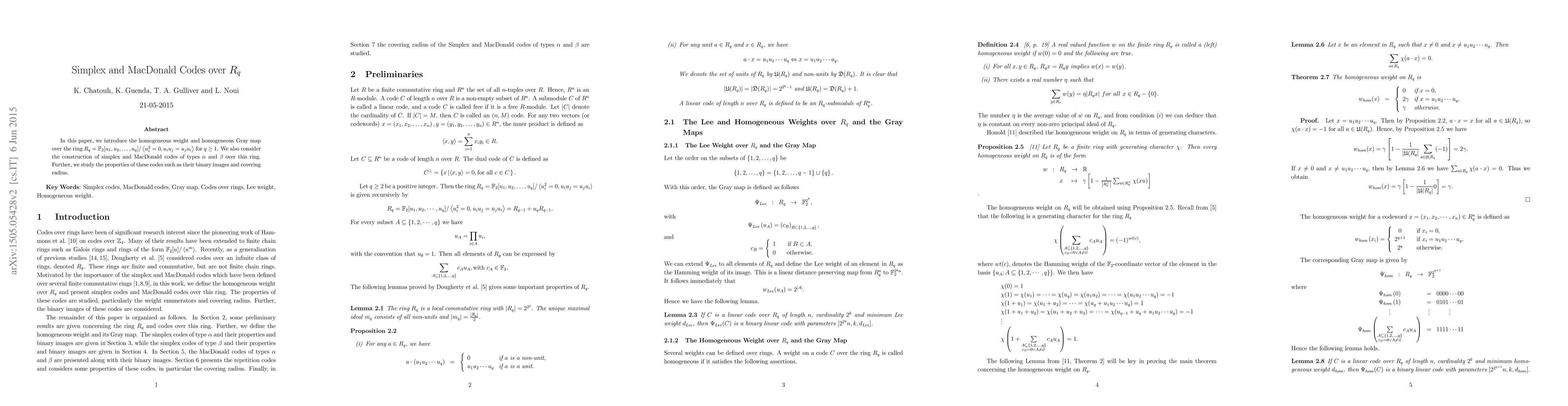 This paper introduces the homogeneous weight and homogeneous Gray map over the ring $R_{q}$, and constructs simplex and MacDonald codes of types $\alpha$ and $\beta$ over this ring.