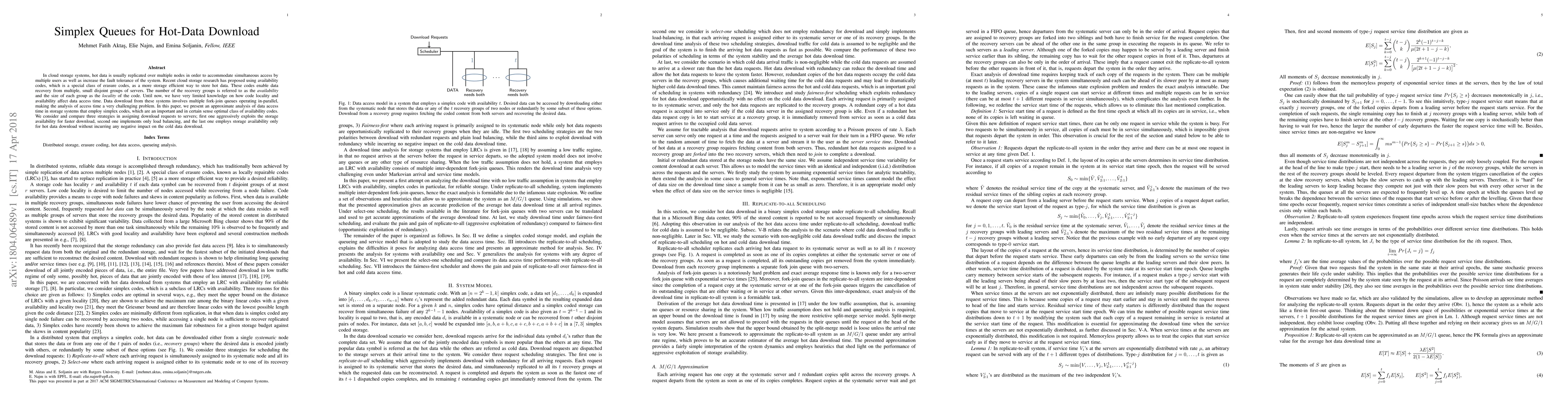 This paper analyzes data access time in cloud storage systems using simplex codes for hot data replication, comparing three strategies for assigning download requests: one that prioritizes faster download, one focused on load balancing, and one that optimizes for hot data without affecting cold data. The study provides insights into how code locality and availability impact download performance.