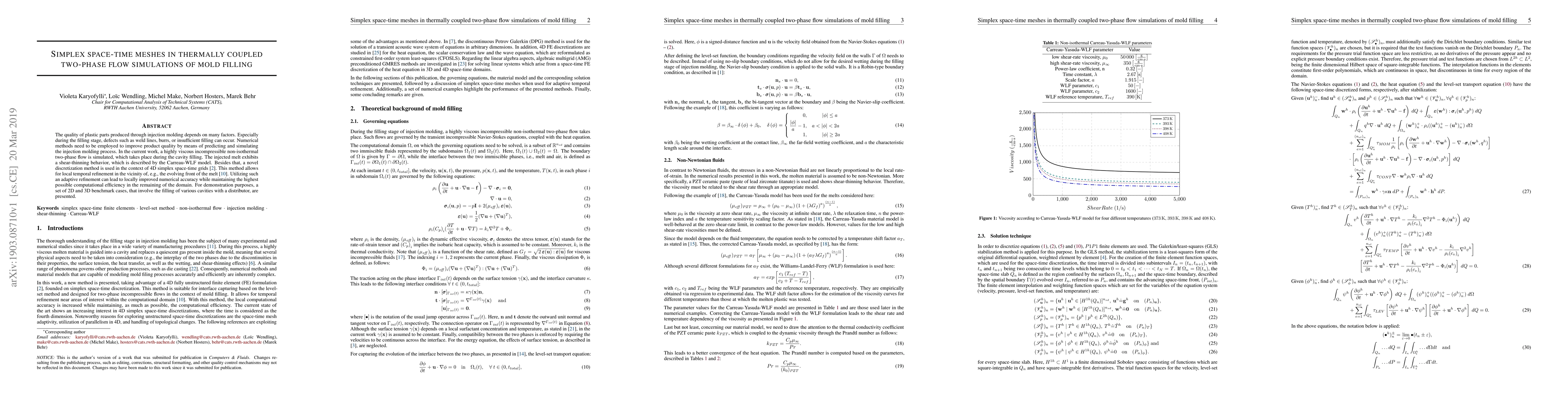 The quality of plastic parts produced through injection molding depends on many factors. Especially during the filling stage, defects such as weld lines, burrs, or insufficient filling can occur. Numerical methods need to be employed to improve product quality by means of predicting and simulating the injection molding process. In the current work, a highly viscous incompressible non-isothermal two-phase flow is simulated, which takes place during the cavity filling. The injected melt exhibits a shear-thinning behavior, which is described by the Carreau-WLF model. Besides that, a novel discretization method is used in the context of 4D simplex space-time grids [2]. This method allows for local temporal refinement in the vicinity of, e.g., the evolving front of the melt [10]. Utilizing such an adaptive refinement can lead to locally improved numerical accuracy while maintaining the highest possible computational efficiency in the remaining of the domain. For demonstration purposes, a set of 2D and 3D benchmark cases, that involve the filling of various cavities with a distributor, are presented.