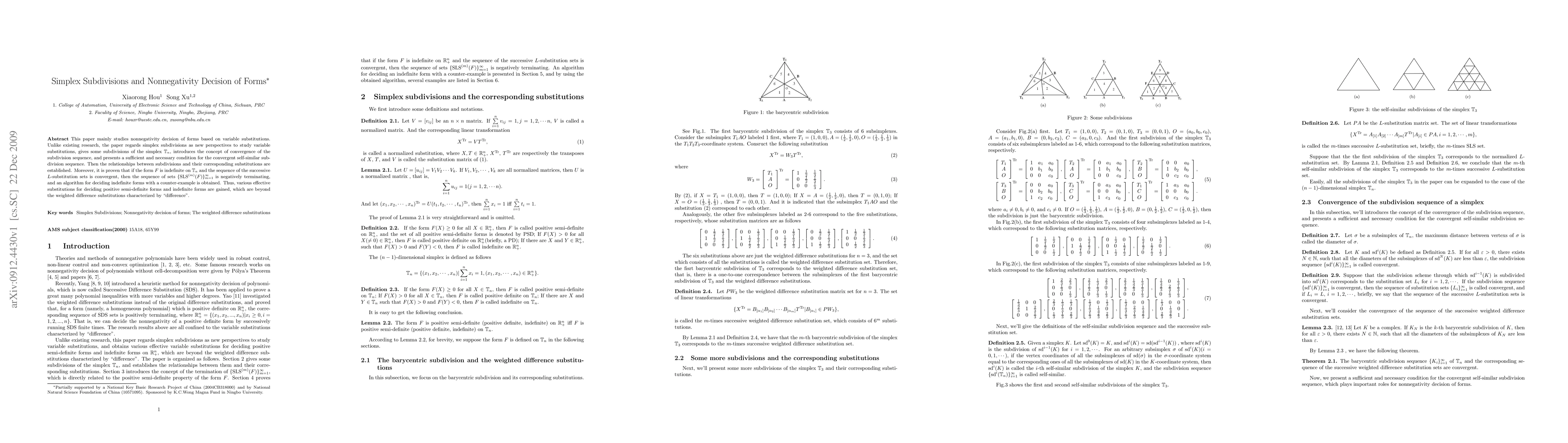 This paper explores the nonnegativity decision of forms using simplex subdivisions and variable substitutions, introducing a new perspective on these methods. It establishes a sufficient and necessary condition for convergent subdivision sequences and proves that convergent sequences lead to negatively terminating sets, providing an algorithm for deciding indefinite forms.
