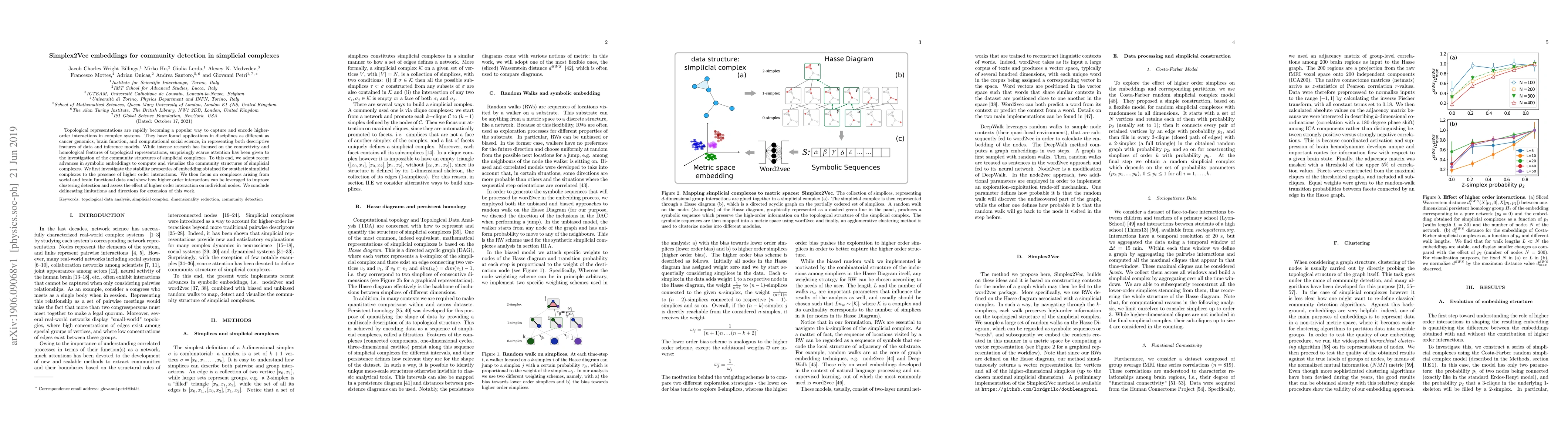This paper explores the use of Simplex2Vec embeddings for detecting community structures in simplicial complexes, focusing on higher-order interactions. It demonstrates improved clustering detection in social and brain functional data, while discussing the stability and limitations of the proposed method.
