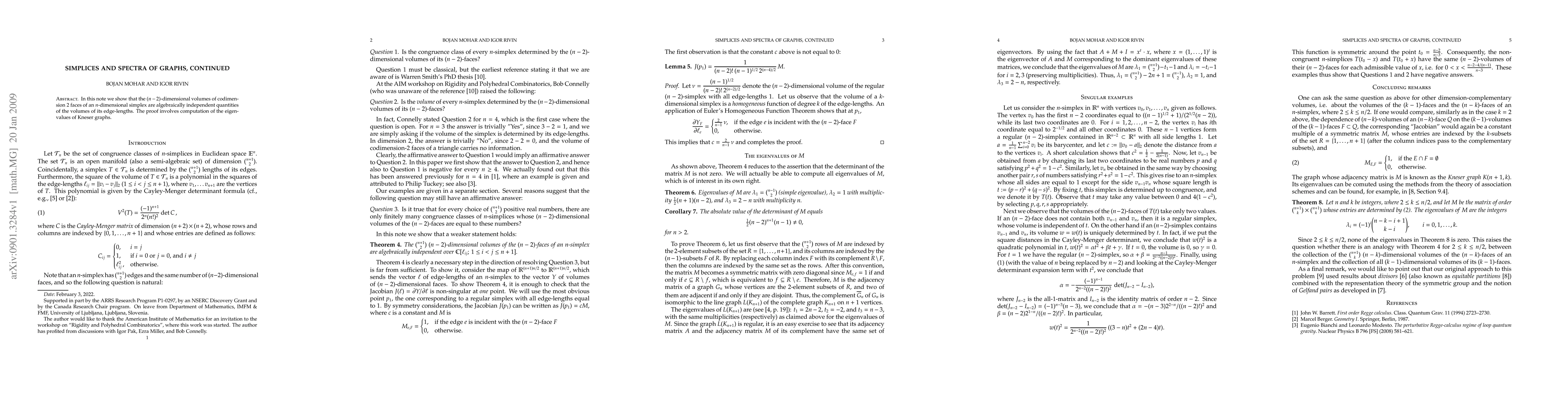 In this note we show that the n-2-dimensional volumes of codimension 2 faces of an n-dimensional simplex are algebraically independent quantities of the volumes of its edge-lengths. The proof involves computation of the eigenvalues of Kneser graphs. We also construct families of non-congurent simplices not determined by their codimension-2 areas.
