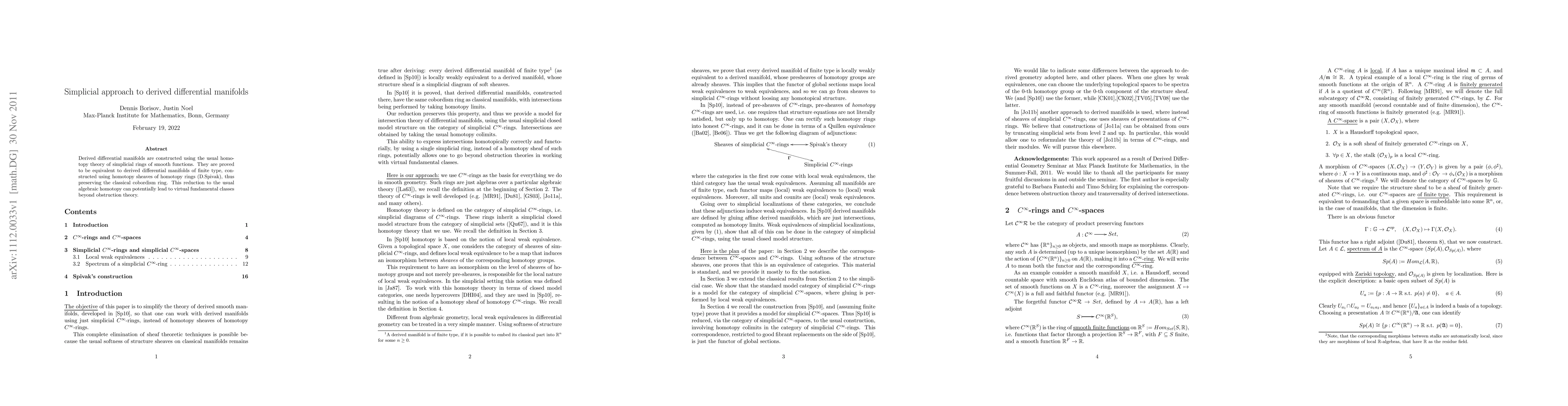 This paper establishes an equivalence between derived differential manifolds constructed via simplicial rings and those built using homotopy sheaves, thus preserving the classical cobordism ring and offering potential for advanced applications like virtual fundamental classes.