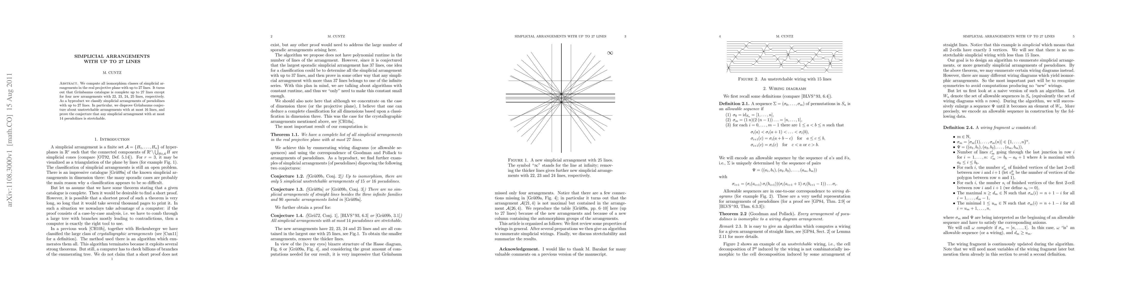 We compute all isomorphism classes of simplicial arrangements in the real projective plane with up to 27 lines. It turns out that Gr\"unbaums catalogue is complete up to 27 lines except for four new arrangements with 22, 23, 24, 25 lines, respectively. As a byproduct we classify simplicial arrangements of pseudolines with up to 27 lines. In particular, we disprove Gr\"unbaums conjecture about unstretchable arrangements with at most 16 lines, and prove the conjecture that any simplicial arrangement with at most 14 pseudolines is stretchable.