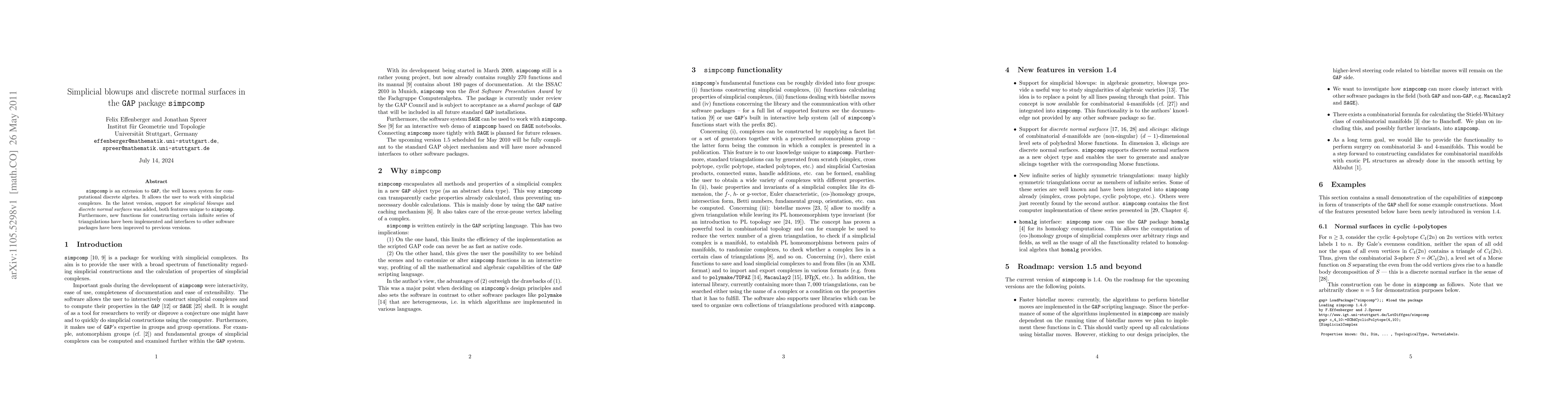 simpcomp is an extension to GAP, the well known system for computational discrete algebra. It allows the user to work with simplicial complexes. In the latest version, support for simplicial blowups and discrete normal surfaces was added, both features unique to simpcomp. Furthermore, new functions for constructing certain infinite series of triangulations have been implemented and interfaces to other software packages have been improved to previous versions.