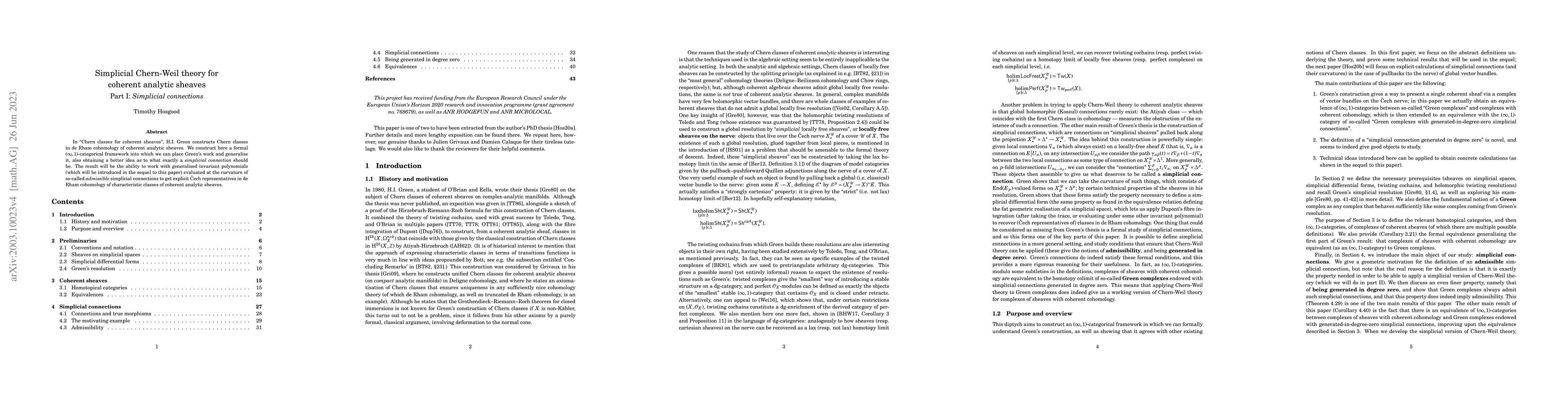The paper develops an $(\infty,1)$-categorical framework to generalize H.I. Green's construction of Chern classes for coherent analytic sheaves, providing clearer definitions of simplicial connections and enabling the computation of explicit Čech representatives in de Rham cohomology. Future work will introduce generalized invariant polynomials evaluated at curvature for these connections.