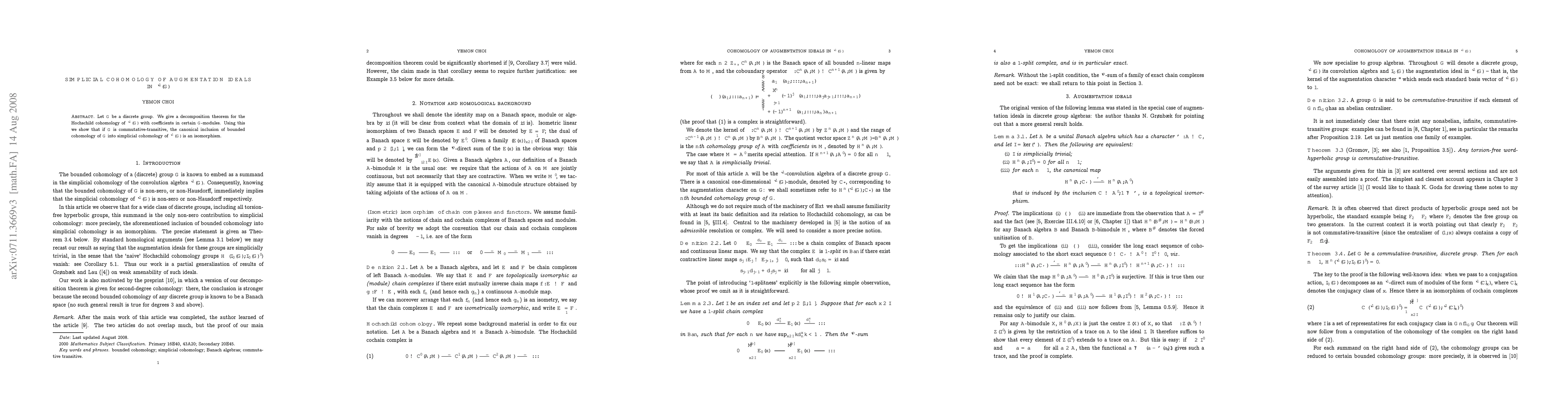 Let $G$ be a discrete group. We give a decomposition theorem for the Hochschild cohomology of $\ell^1(G)$ with coefficients in certain $G$-modules. Using this we show that if $G$ is commutative-transitive, the canonical inclusion of bounded cohomology of $G$ into simplicial cohomology of $\ell^1(G)$ is an isomorphism.