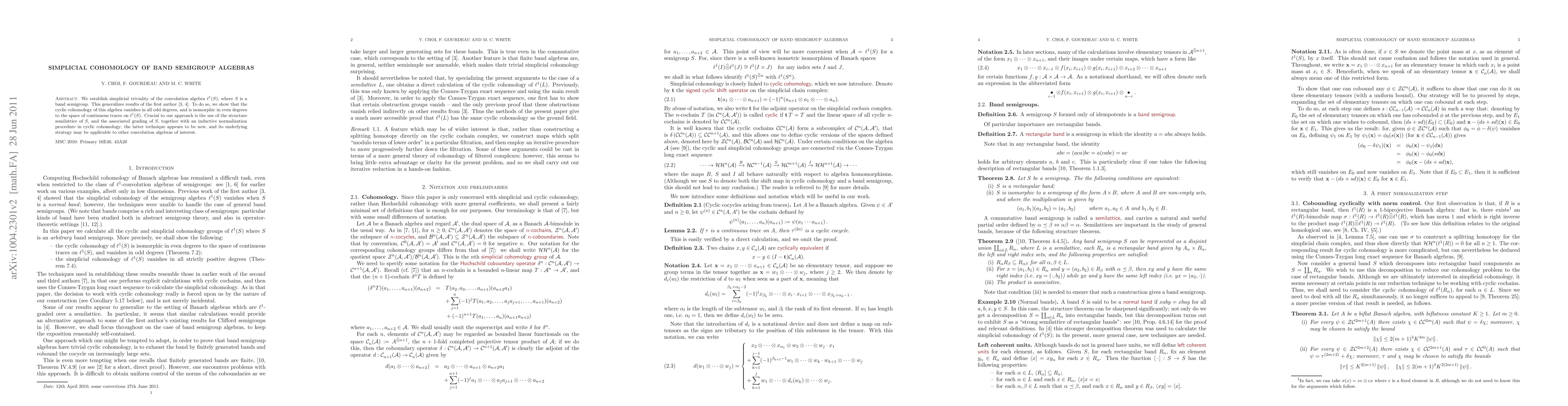 Researchers prove that a specific algebra related to band semigroups has cyclic cohomology that vanishes in odd degrees and is equivalent to the space of continuous traces in even degrees.