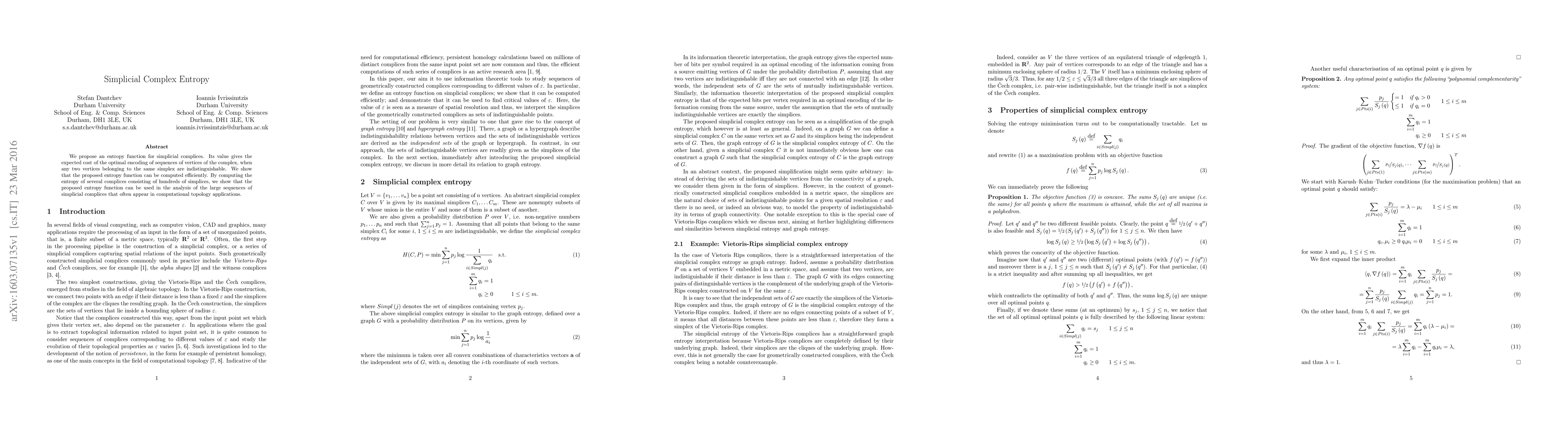 We propose an entropy function for simplicial complices. Its value gives the expected cost of the optimal encoding of sequences of vertices of the complex, when any two vertices belonging to the same simplex are indistinguishable. We show that the proposed entropy function can be computed efficiently. By computing the entropy of several complices consisting of hundreds of simplices, we show that the proposed entropy function can be used in the analysis of the large sequences of simplicial complices that often appear in computational topology applications.