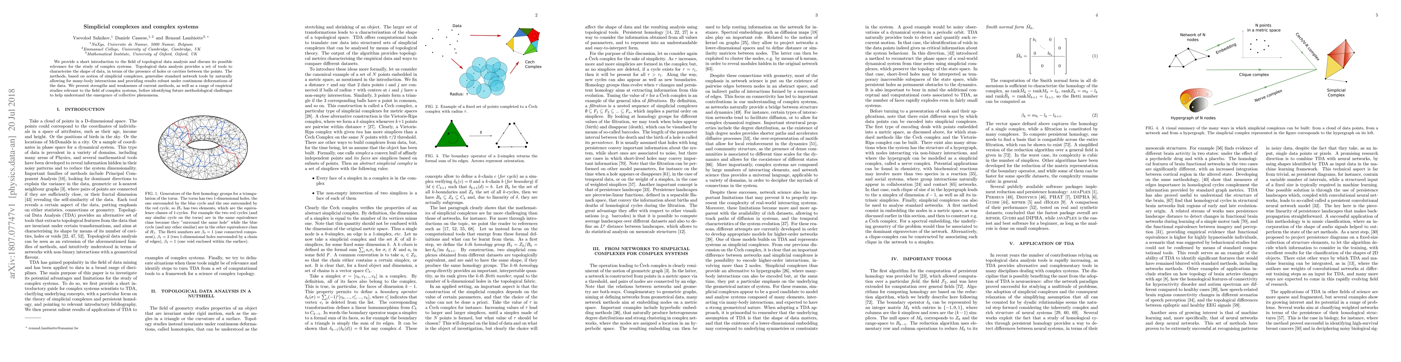 We provide a short introduction to the field of topological data analysis and discuss its possible relevance for the study of complex systems. Topological data analysis provides a set of tools to characterise the shape of data, in terms of the presence of holes or cavities between the points. The methods, based on notion of simplicial complexes, generalise standard network tools by naturally allowing for many-body interactions and providing results robust under continuous deformations of the data. We present strengths and weaknesses of current methods, as well as a range of empirical studies relevant to the field of complex systems, before identifying future methodological challenges to help understand the emergence of collective phenomena.
