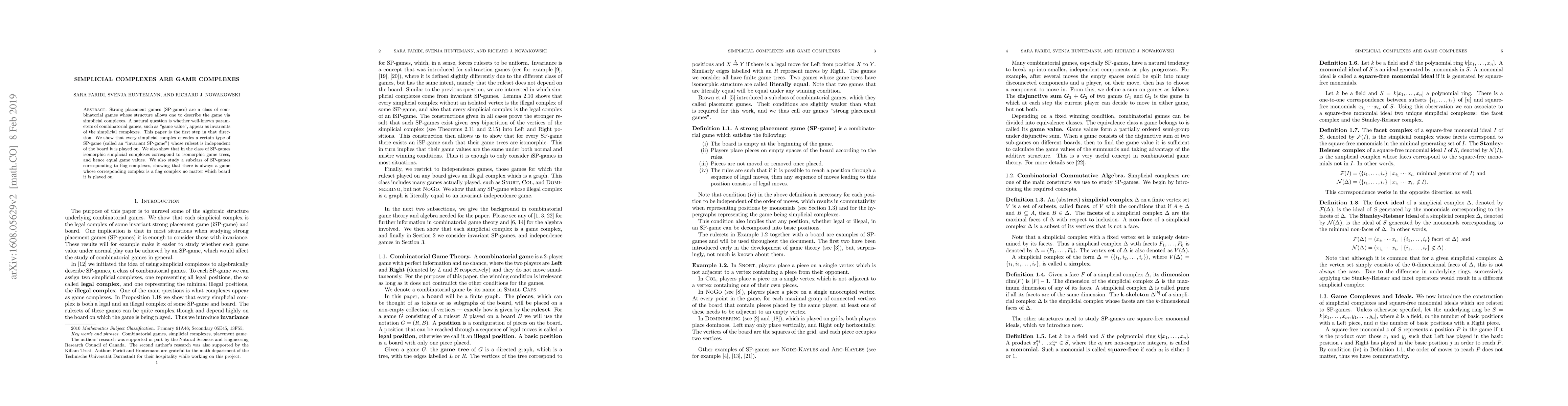 This paper demonstrates that simplicial complexes can encode strong placement games (SP-games), establishing an invariant SP-game for each complex whose rules are board-independent. It also reveals that isomorphic simplicial complexes yield isomorphic game trees and equal game values.