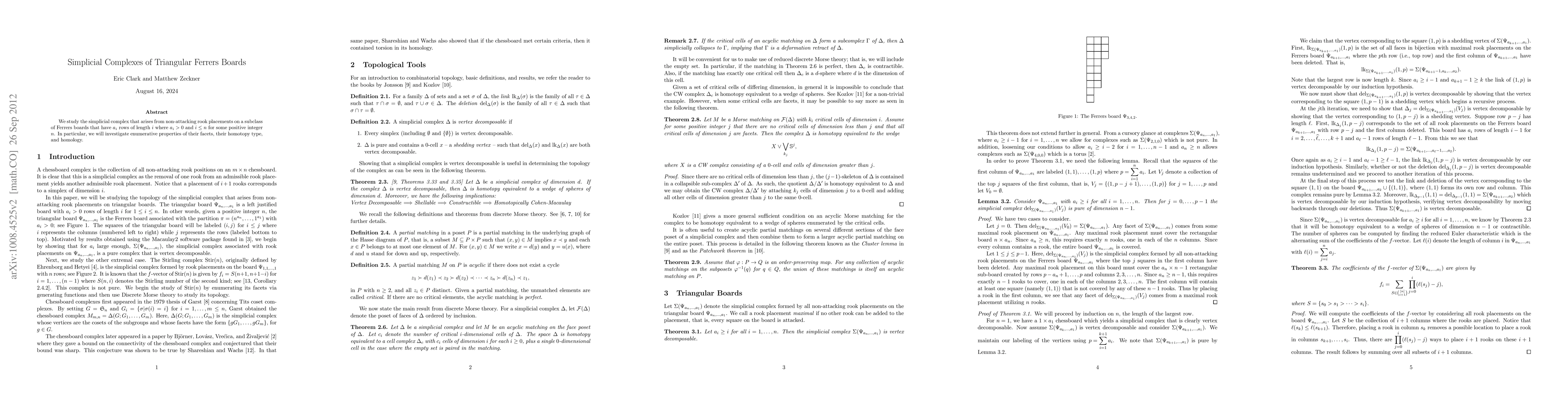 This paper investigates the simplicial complexes formed by non-attacking rook placements on triangular Ferrers boards, focusing on enumerative properties of facets, their homotopy type, and homology.