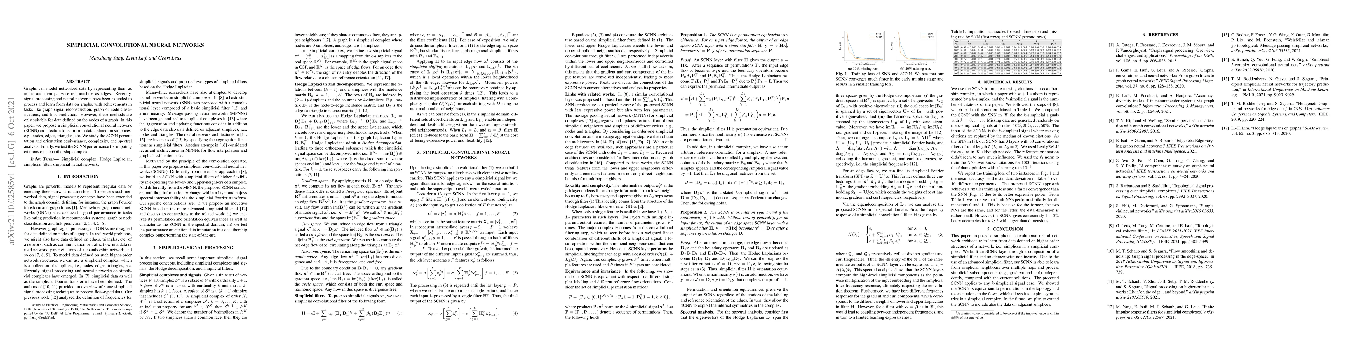 This paper proposes a simplicial convolutional neural network (SCNN) to learn from data on simplices (nodes, edges, triangles, etc.) in a graph, examining its equivariance, complexity, and spectral properties. The SCNN is tested for citation imputation on a coauthorship network.