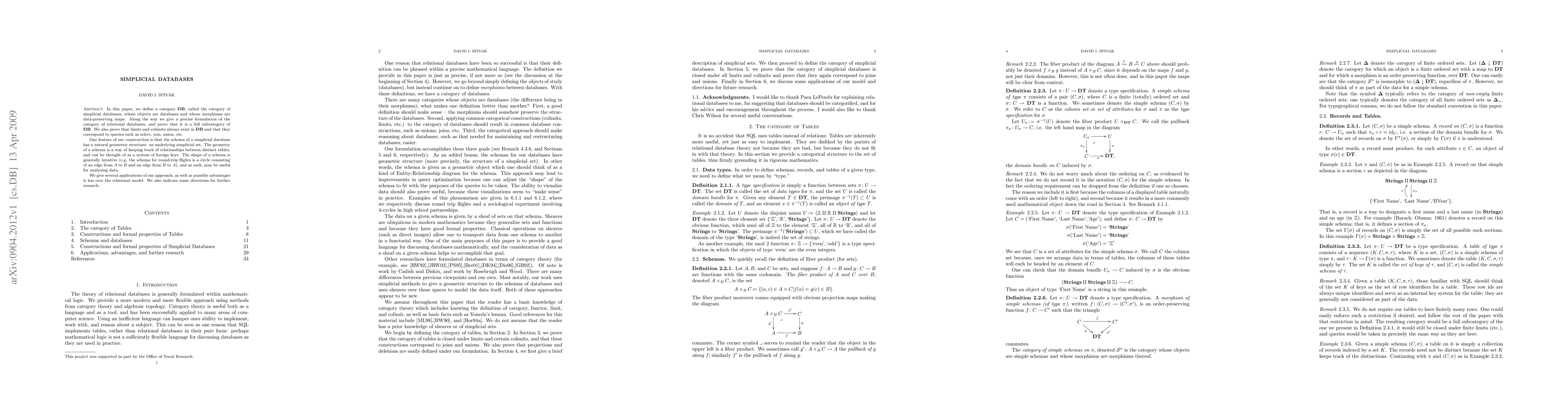 In this paper, we define a category DB, called the category of simplicial databases, whose objects are databases and whose morphisms are data-preserving maps. Along the way we give a precise formulation of the category of relational databases, and prove that it is a full subcategory of DB. We also prove that limits and colimits always exist in DB and that they correspond to queries such as select, join, union, etc. One feature of our construction is that the schema of a simplicial database has a natural geometric structure: an underlying simplicial set. The geometry of a schema is a way of keeping track of relationships between distinct tables, and can be thought of as a system of foreign keys. The shape of a schema is generally intuitive (e.g. the schema for round-trip flights is a circle consisting of an edge from $A$ to $B$ and an edge from $B$ to $A$), and as such, may be useful for analyzing data. We give several applications of our approach, as well as possible advantages it has over the relational model. We also indicate some directions for further research.