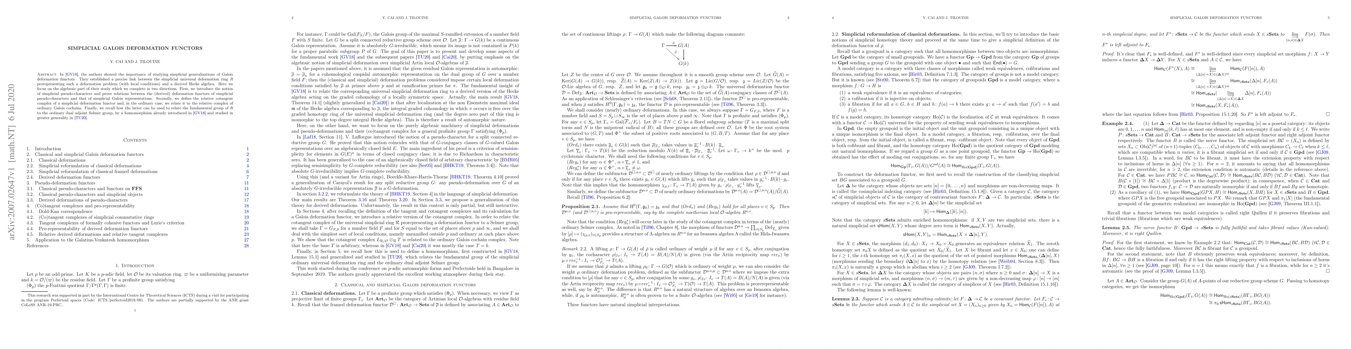 This paper completes the algebraic aspects of a study by Galatius and Venkatesh on simplicial Galois deformation functors, introducing simplicial pseudo-characters and linking them to deformation functors. It also defines the relative cotangent complex and connects it to the ordinary Galois cochains, ultimately relating the fundamental group of the deformation ring to the dual adjoint Selmer group.