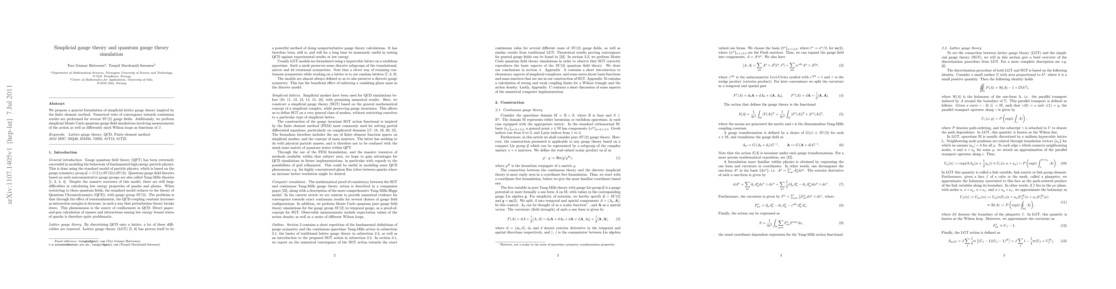 This paper proposes a simplicial lattice gauge theory formulation that simulates quantum gauge fields using the finite element method, with promising convergence to continuum results and useful insights into Wilson loop measurements.