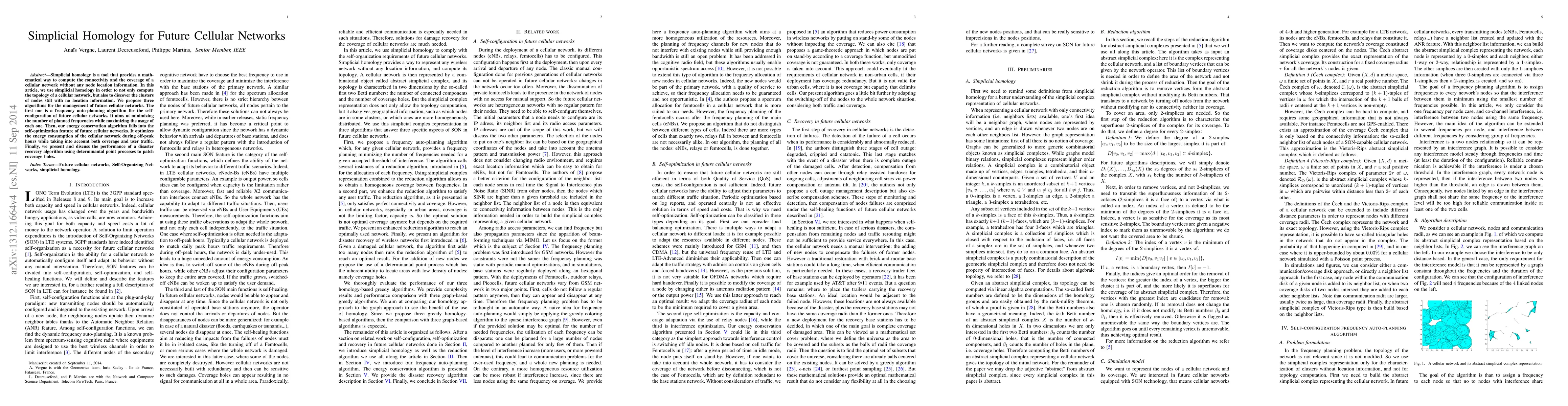 This paper employs simplicial homology to analyze the connectivity and clustering of future cellular networks without node location data. It proposes three algorithms: a frequency auto-planning algorithm, an energy conservation algorithm, and a disaster recovery algorithm using determinantal point processes to manage network topology and optimize performance.