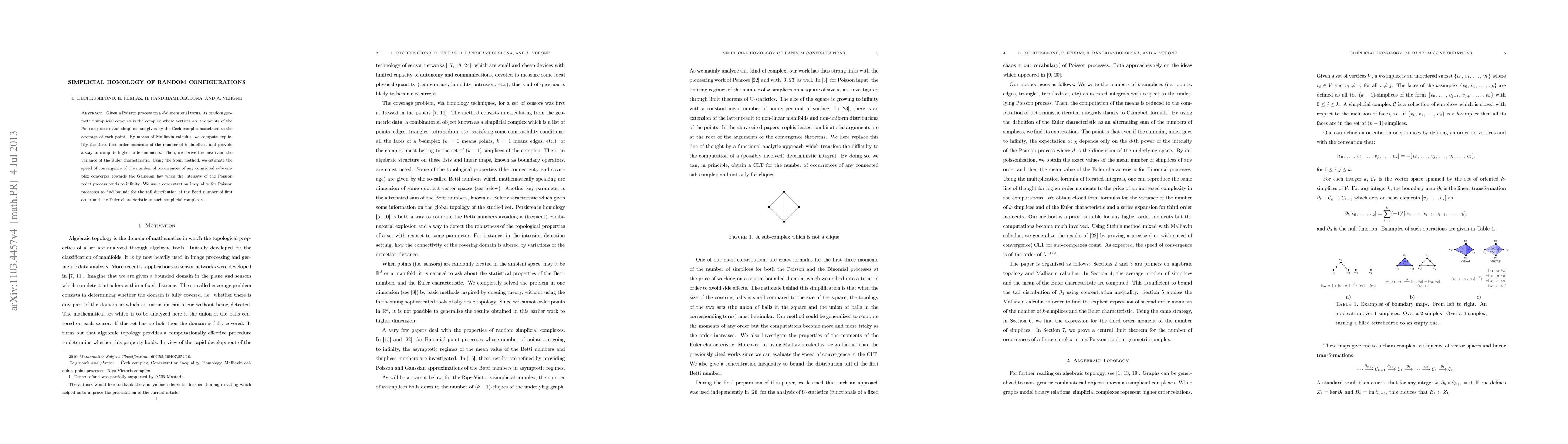 Given a Poisson process on a $d$-dimensional torus, its random geometric simplicial complex is the complex whose vertices are the points of the Poisson process and simplices are given by the \u{C}ech complex associated to the coverage of each point. By means of Malliavin calculus, we compute explicitly the n$th$ order moment of the number of $k$-simplices. The two first order moments of this quantity allow us to find the mean and the variance of the Euler caracteristic. Also, we show that the number of any connected geometric simplicial complex converges to the Gaussian law when the intensity of the Poisson point process tends to infinity. We use a concentration inequality to find bounds for the for the distribution of the Betti number of first order and the Euler characteristic in such simplicial complex.