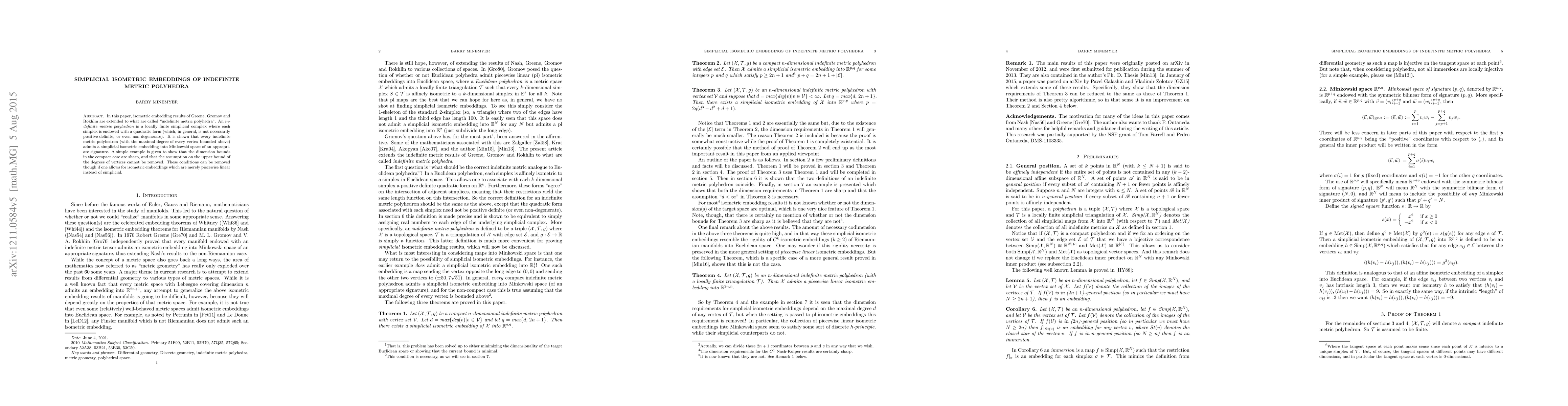 In this paper, isometric embedding results of Greene, Gromov and Rokhlin are extended to what are called "indefinite metric polyhedra". Two definitions for an indefinite metric polyhedron are given, an intuitive definition and a more useful definition. The more useful definition is used to show that every indefinite metric polyhedron (with the maximal degree of every vertex bounded above) admits a simplicial isometric embedding into Minkowski space of an appropriate signature. This result is then used to show that the two definitions coincide. A simple example is given to show that the dimension bounds in the compact case are essentially sharp. Finally it is shown that if we relax our embedding conditions to be pl instead of simplicial, then the necessary dimension bounds can be reduced to a surprisingly low signature.