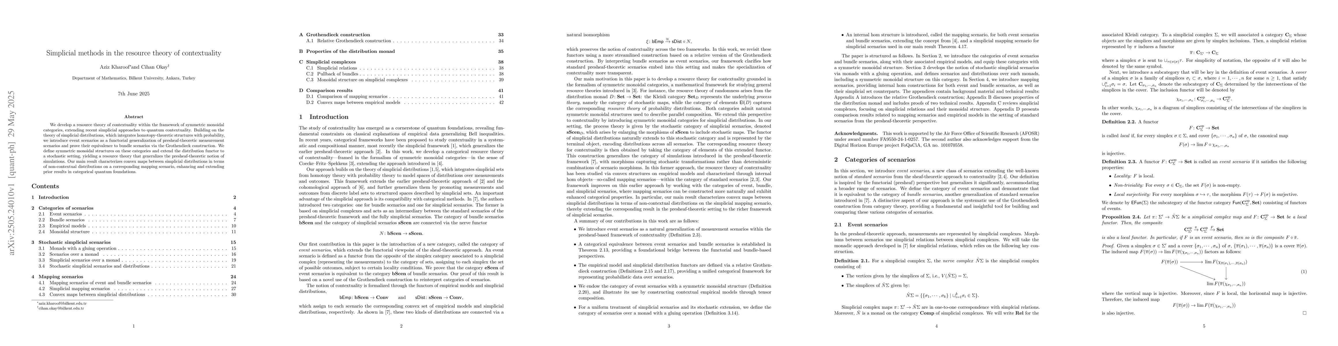 The introduction of simplicial methods in the resource theory of contextuality, generalizing presheaf-theoretic approaches and characterizing convex maps in terms of non-contextual distributions.