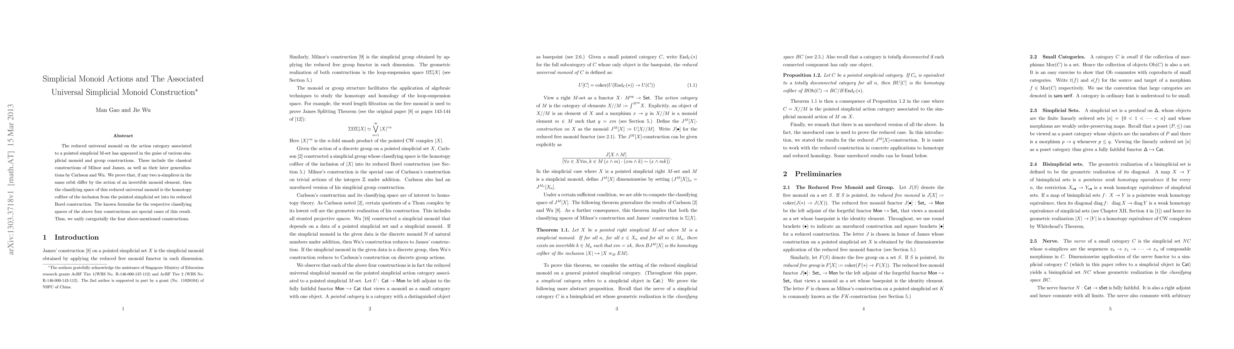 This paper unifies four simplicial monoid constructions by proving a key relationship between their classifying spaces, demonstrating that the reduced universal monoid construction is equivalent to the homotopy cofiber of an inclusion.