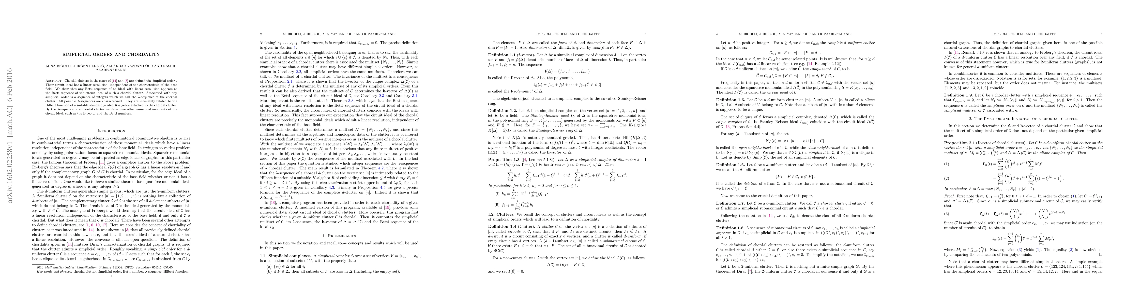 Chordal clutters in the sense of [14] and [3] are defined via simplicial orders. Their circuit ideal has a linear resolution, independent of the characteristic of the base field. We show that any Betti sequence of an ideal with linear resolution appears as the Betti sequence of the circuit ideal of such a chordal clutter. Associated with any simplicial order is a sequence of integers which we call the $\lambda$-sequence of the chordal clutter. All possible $\lambda$-sequences are characterized. They are intimately related to the Hilbert function of a suitable standard graded $K$-algebra attached to the chordal clutter. By the $\lambda$-sequence of a chordal clutter we determine other numerical invariants of the circuit ideal, such as the $\textbf{h}$-vector and the Betti numbers.