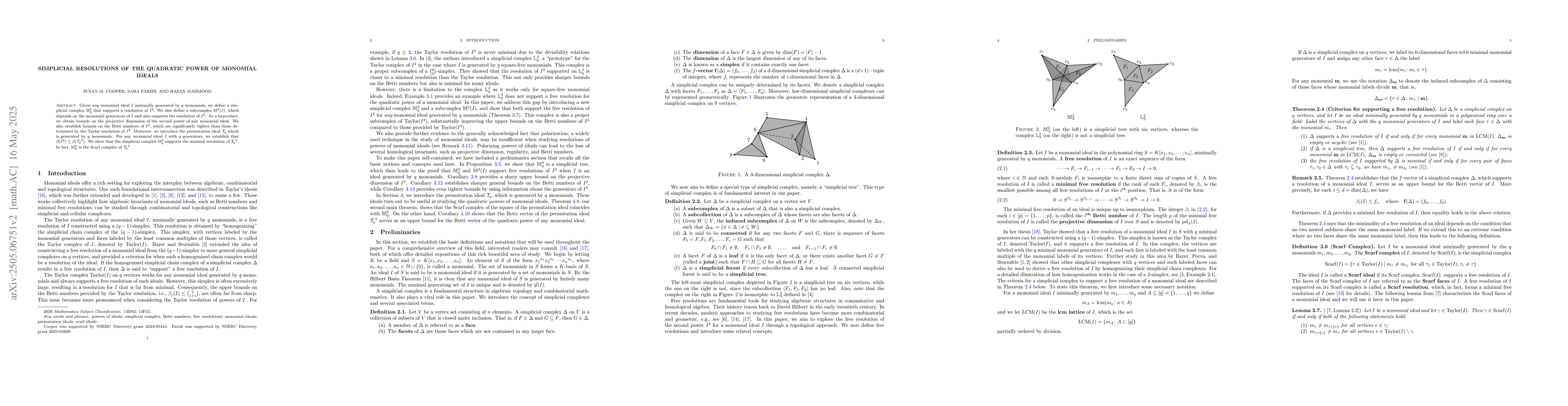 The paper introduces simplicial complexes M_q^2 and M^2(I) and proves their resolution properties for I^2, along with bounds on Betti numbers and projective dimension.