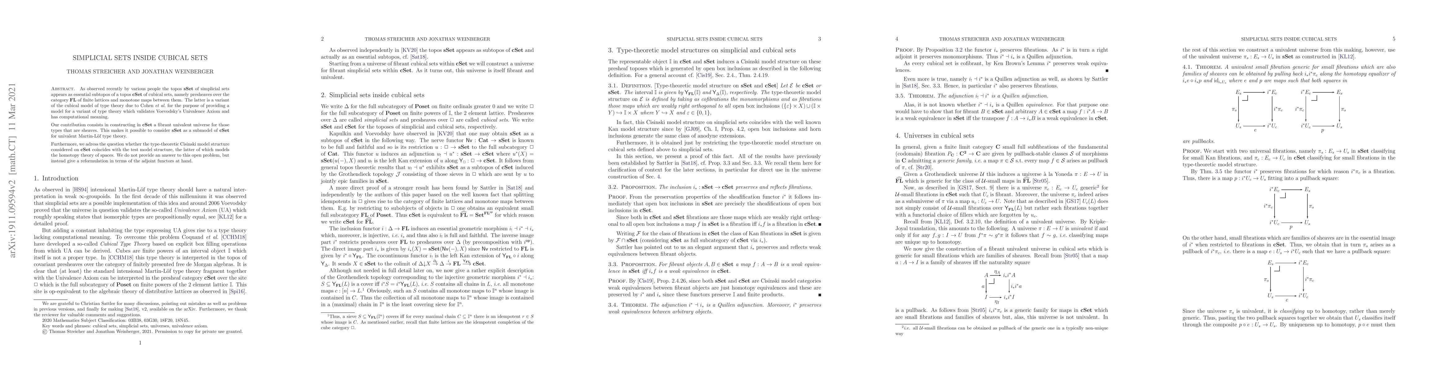 This paper explores the relationship between simplicial sets and cubical sets within the context of type theory, showing that simplicial sets form an essential subtopos of cubical sets. It constructs a fibrant univalent universe in cubical sets for sheaf types, enabling the view of simplicial sets as a submodel of cubical sets for univalent type theory. The paper also reformulates the open problem regarding the equivalence of two model structures on cubical sets in terms of adjoint functors.
