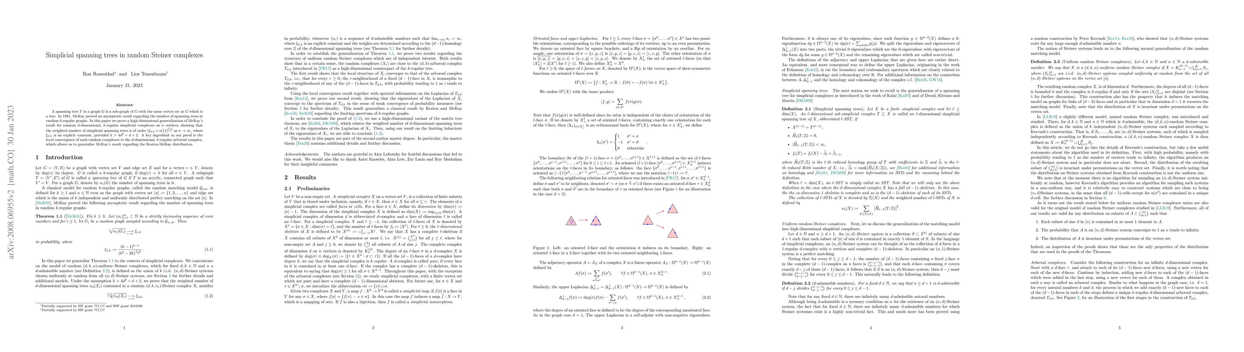A spanning tree $T$ in a graph $G$ is a sub-graph of $G$ with the same vertex set as $G$ which is a tree. In 1981, McKay proved an asymptotic result regarding the number of spanning trees in random $k$-regular graphs. In this paper we prove a high-dimensional generalization of McKay's result for random $d$-dimensional, $k$-regular simplicial complexes on $n$ vertices, showing that the weighted number of simplicial spanning trees is of order $(\xi_{d,k}+o(1))^{\binom{n}{d}}$ as $n\to\infty$, where $\xi_{d,k}$ is an explicit constant, provided $k> 4d^2+d+2$. A key ingredient in our proof is the local convergence of such random complexes to the $d$-dimensional, $k$-regular arboreal complex, which allows us to generalize McKay's result regarding the Kesten-McKay distribution.