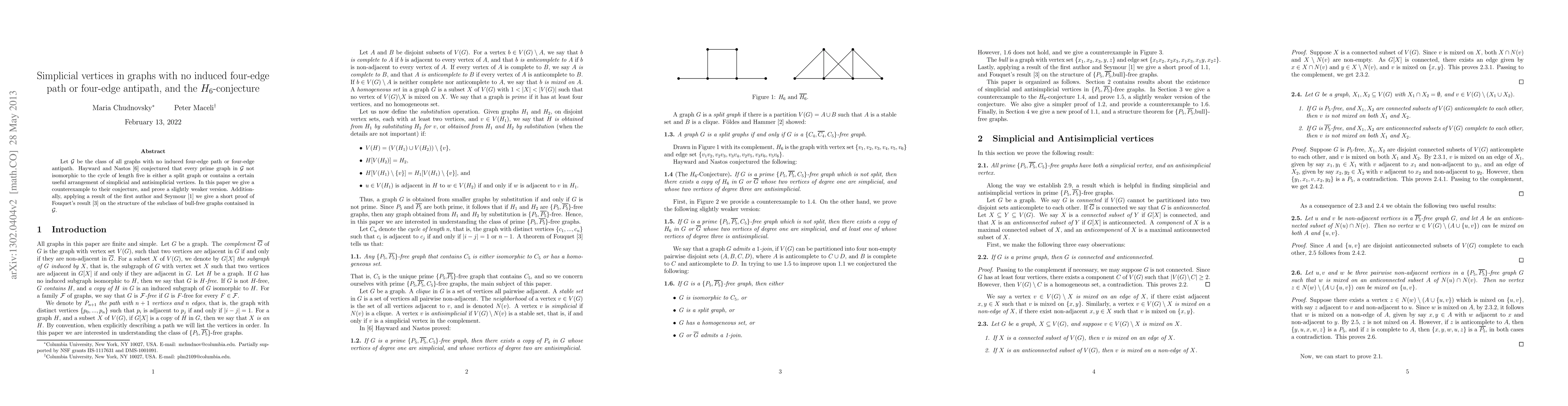 Let $\mathcal{G}$ be the class of all graphs with no induced four-edge path or four-edge antipath. Hayward and Nastos \cite{MS} conjectured that every prime graph in $\mathcal{G}$ not isomorphic to the cycle of length five is either a split graph or contains a certain useful arrangement of simplicial and antisimplicial vertices. In this paper we give a counterexample to their conjecture, and prove a slightly weaker version. Additionally, applying a result of the first author and Seymour \cite{grow} we give a short proof of Fouquet's result \cite{C5} on the structure of the subclass of bull-free graphs contained in $\mathcal{G}$.