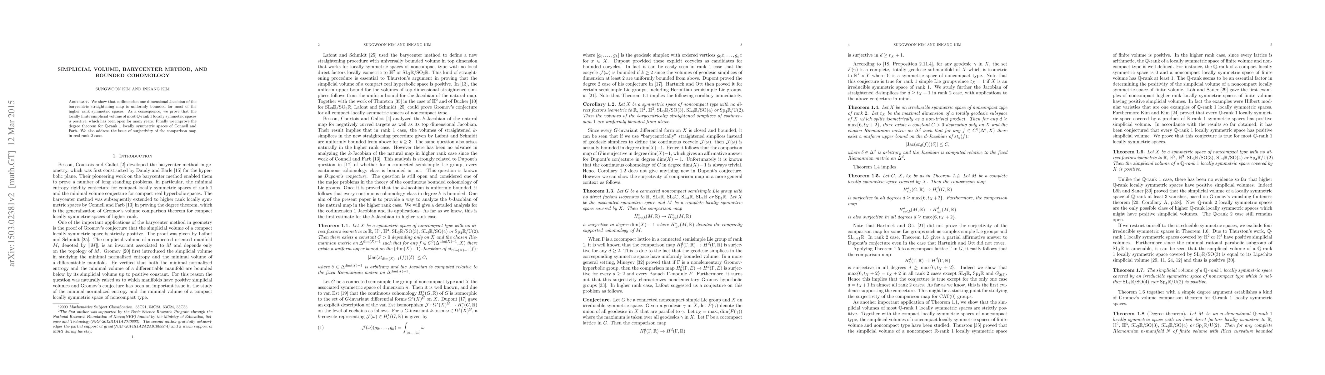 We show that codimension one dimensional Jacobian of the barycentric straightening map is uniformly bounded for most of the higher rank symmetric spaces. As a consequence, we prove that the locally finite simplicial volume of most $\mathbb Q$-rank $1$ locally symmetric spaces is positive, which has been open for many years. Finally we improve the degree theorem for $\mathbb Q$-rank $1$ locally symmetric spaces of Connell and Farb. We also address the issue of surjectivity of the comparison map in real rank $2$ case.