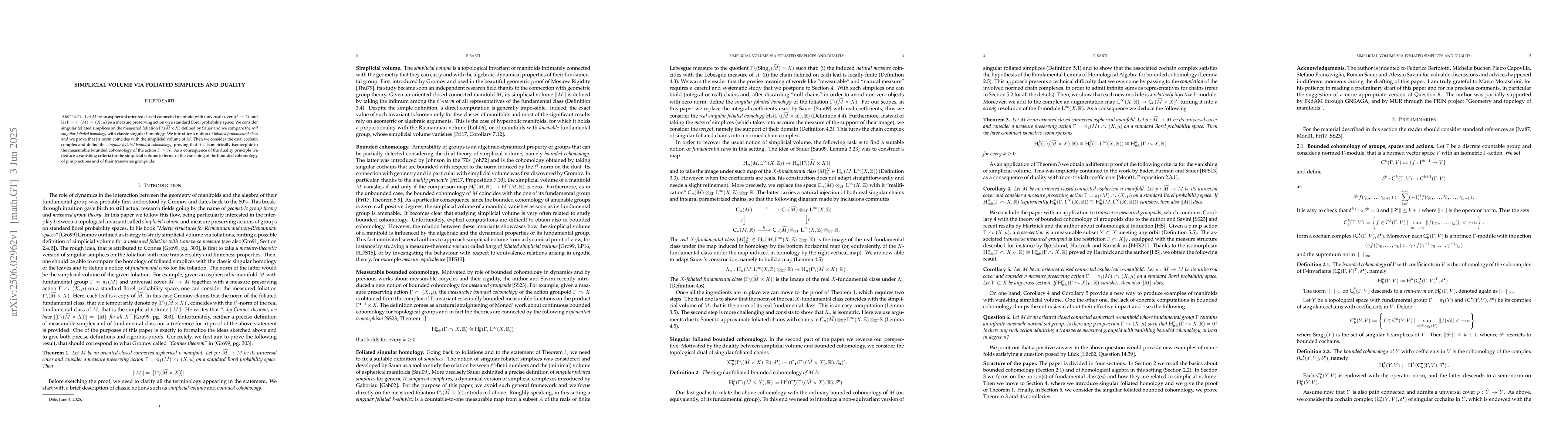The paper presents a novel approach to simplicial volume computation using foliated simplices and duality, linking it to bounded cohomology of group actions and transverse groupoids