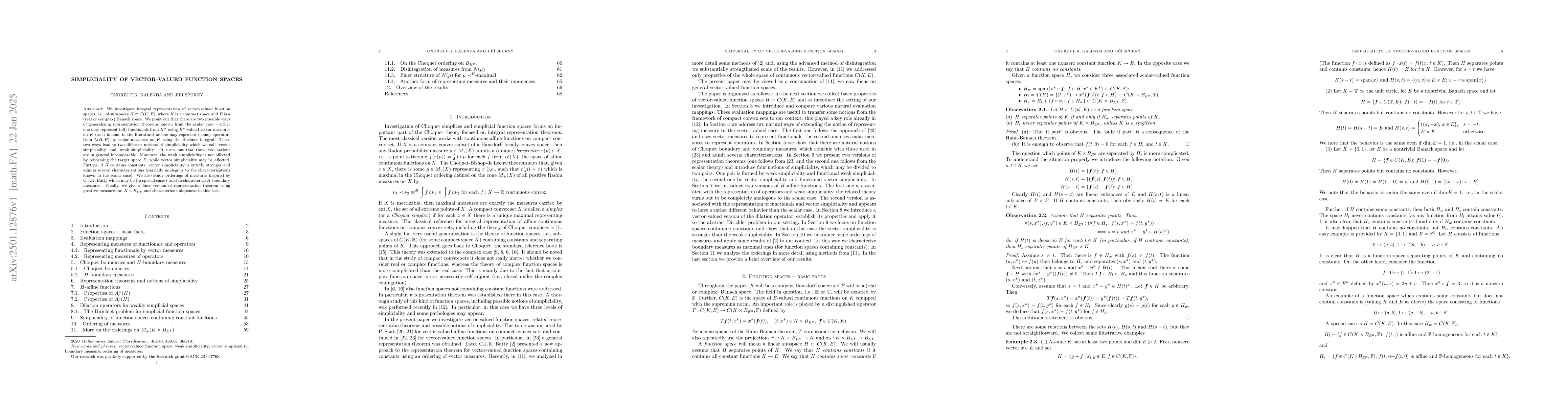 This paper explores integral representations of vector-valued function spaces and introduces two notions of simpliciality: vector and weak simpliciality. It demonstrates that these notions are generally incomparable and examines their properties under renorming and the presence of constants in the function space. The study also delves into measure orderings to characterize boundary measures and provides a refined representation theorem using positive measures.
