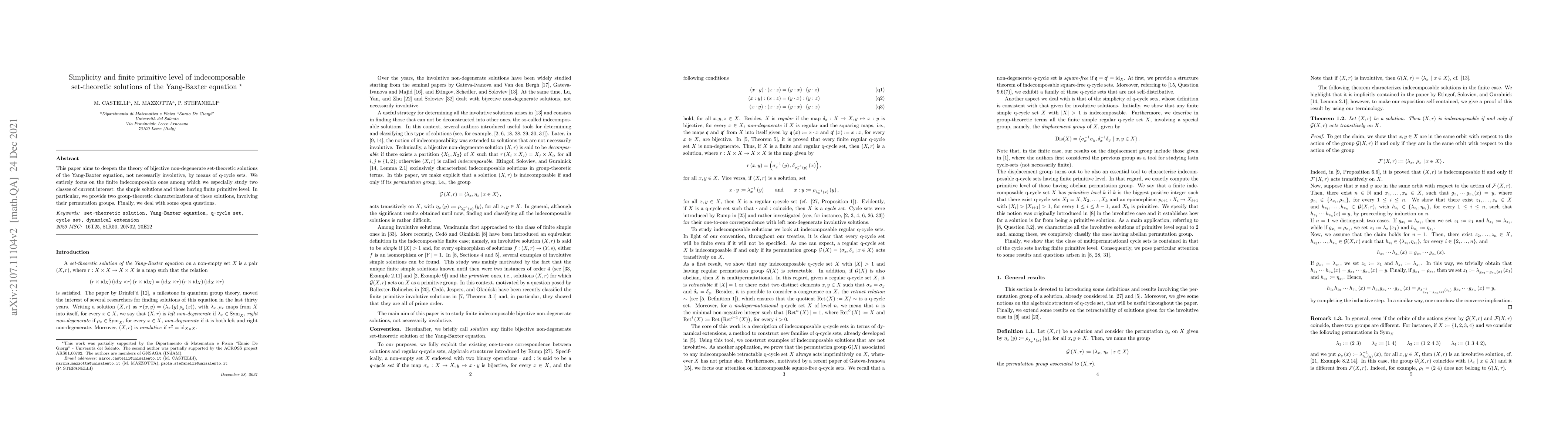 This paper aims to deepen the theory of bijective non-degenerate set-theoretic solutions of the Yang-Baxter equation, not necessarily involutive, by means of q-cycle sets. We entirely focus on the finite indecomposable ones among which we especially study two classes of current interest: the simple solutions and those having finite primitive level. In particular, we provide two group-theoretic characterizations of these solutions, involving their permutation groups. Finally, we deal with some open questions.