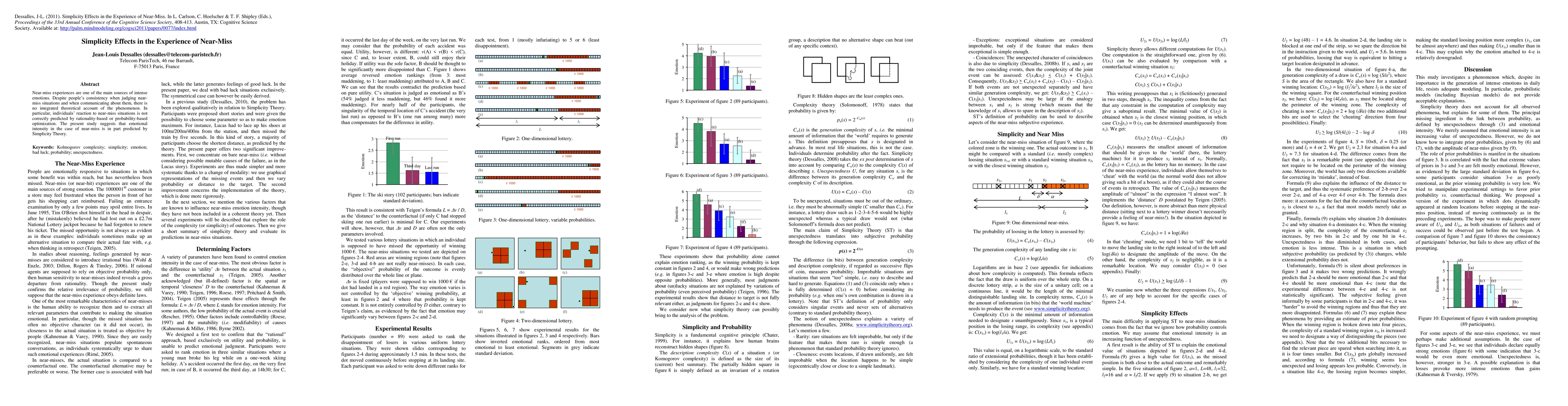 Near-miss experiences are one of the main sources of intense emotions. Despite people's consistency when judging near-miss situations and when communicating about them, there is no integrated theoretical account of the phenomenon. In particular, individuals' reaction to near-miss situations is not correctly predicted by rationality-based or probability-based optimization. The present study suggests that emotional intensity in the case of near-miss is in part predicted by Simplicity Theory.