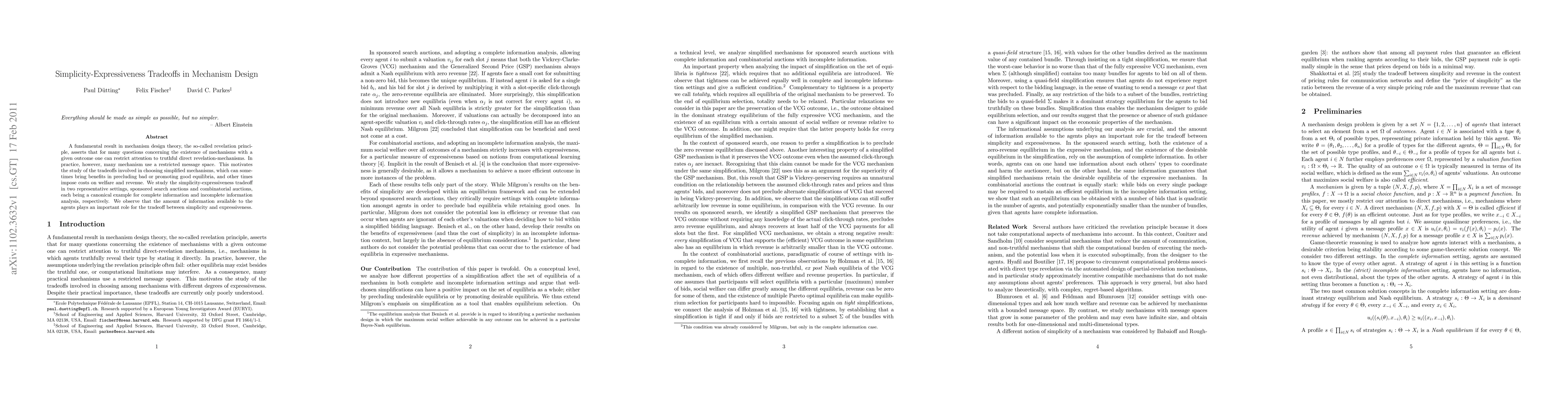 A fundamental result in mechanism design theory, the so-called revelation principle, asserts that for many questions concerning the existence of mechanisms with a given outcome one can restrict attention to truthful direct revelation-mechanisms. In practice, however, many mechanism use a restricted message space. This motivates the study of the tradeoffs involved in choosing simplified mechanisms, which can sometimes bring benefits in precluding bad or promoting good equilibria, and other times impose costs on welfare and revenue. We study the simplicity-expressiveness tradeoff in two representative settings, sponsored search auctions and combinatorial auctions, each being a canonical example for complete information and incomplete information analysis, respectively. We observe that the amount of information available to the agents plays an important role for the tradeoff between simplicity and expressiveness.