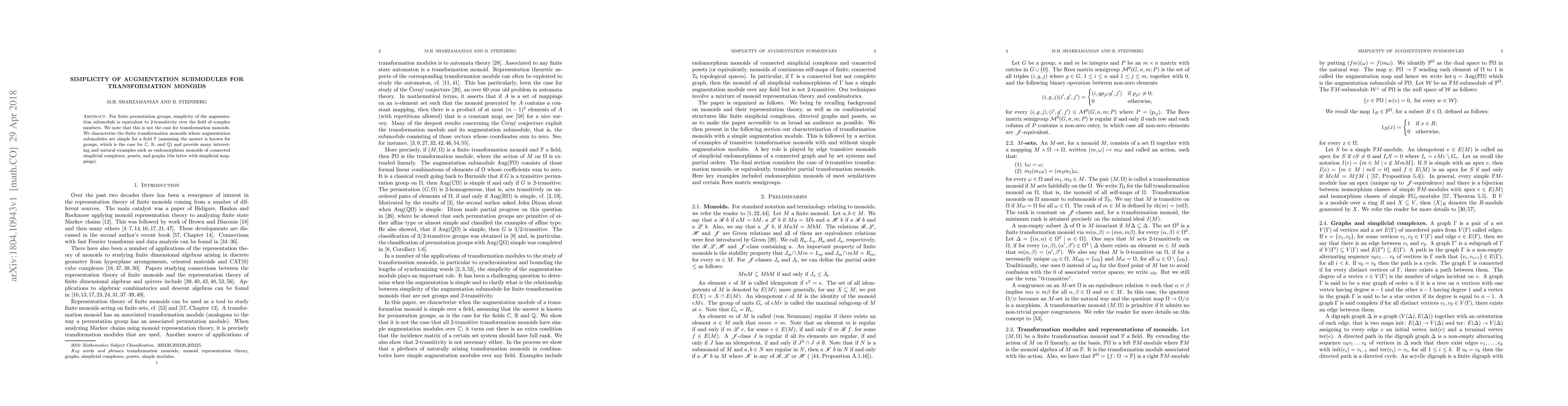 This paper explores the simplicity of augmentation submodules in transformation monoids, contrasting it with the $2$-transitivity equivalence in finite permutation groups. It characterizes finite transformation monoids with simple augmentation submodules over fields, providing examples from endomorphisms of simplicial complexes, posets, and graphs.