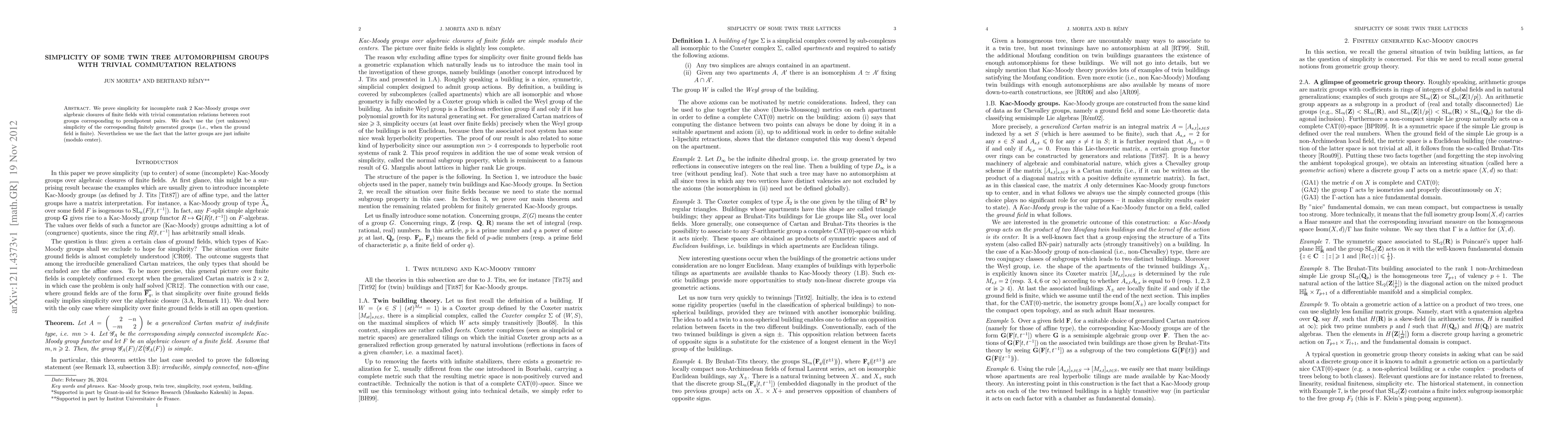 This paper proves the simplicity of incomplete rank 2 Kac-Moody groups over algebraic closures of finite fields, focusing on those with trivial commutation relations between root groups corresponding to prenilpotent pairs. The proof does not rely on the unknown simplicity of the corresponding finitely generated groups but leverages their just infinite property modulo the center.