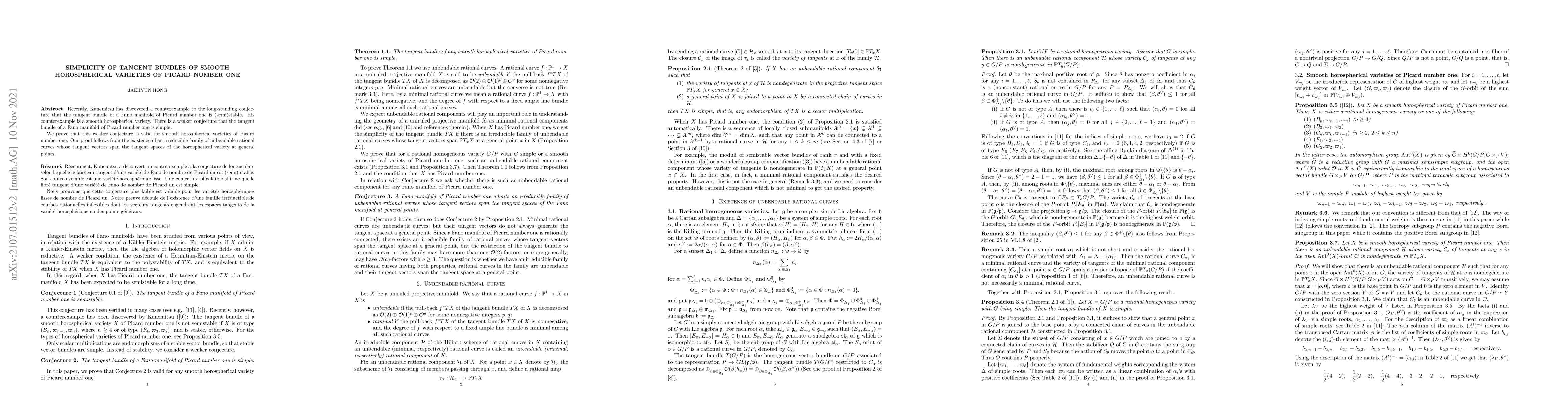 Summary: Kanemitsu's counterexample disproves the conjecture of (semi)stable tangent bundles for Fano manifolds of Picard number one. However, the paper proves that the tangent bundle of smooth horospherical varieties of Picard number one is simple, supported by the existence of an irreducible family of unbendable rational curves.