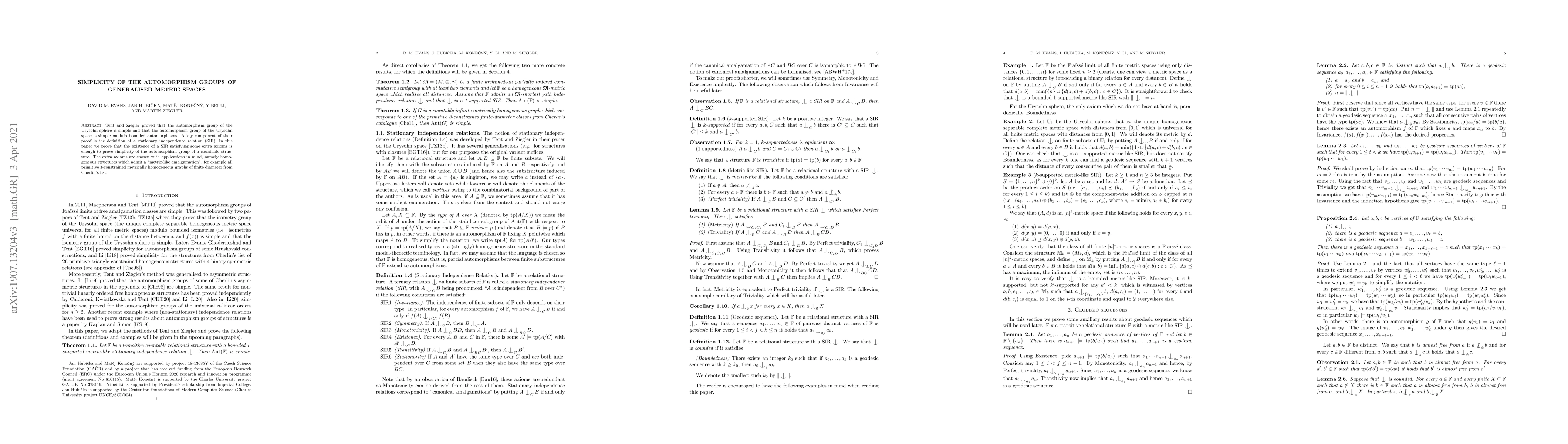 Tent and Ziegler proved that the automorphism group of the Urysohn sphere is simple and that the automorphism group of the Urysohn space is simple modulo bounded automorphisms. A key component of their proof is the definition of a stationary independence relation (SIR). In this paper we prove that the existence of a SIR satisfying some extra axioms is enough to prove simplicity of the automorphism group of a countable structure. The extra axioms are chosen with applications in mind, namely homogeneous structures which admit a "metric-like amalgamation", for example all primitive 3-constrained metrically homogeneous graphs of finite diameter from Cherlin's list.