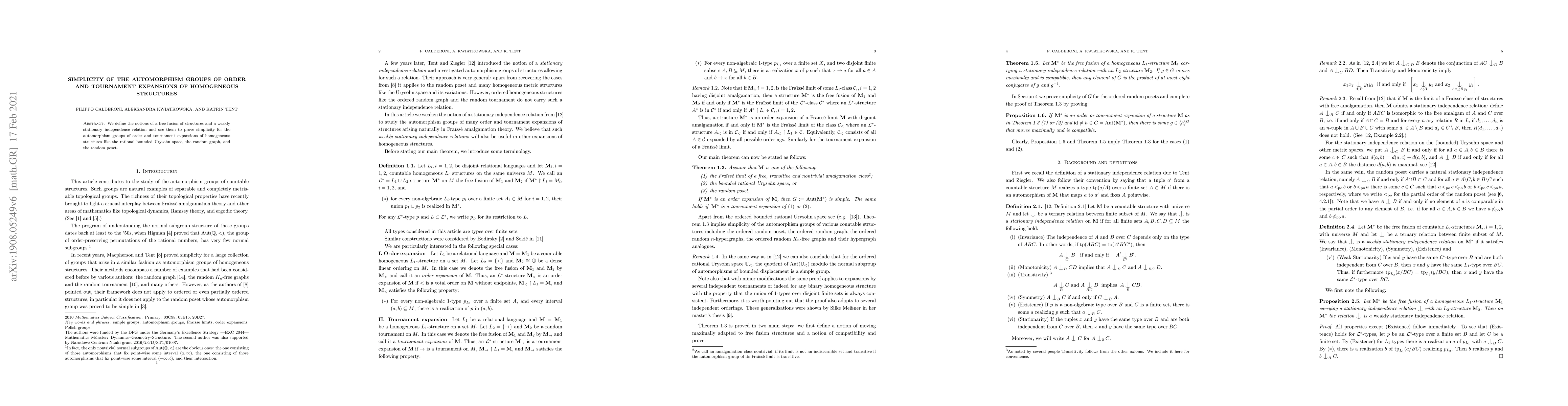 We define the notions of a free fusion of structures and a weakly stationary independence relation. We apply these notions to prove simplicity for the automorphism groups of order and tournament expansions of homogeneous structures like the bounded Urysohn space, the random graph, and the random poset.