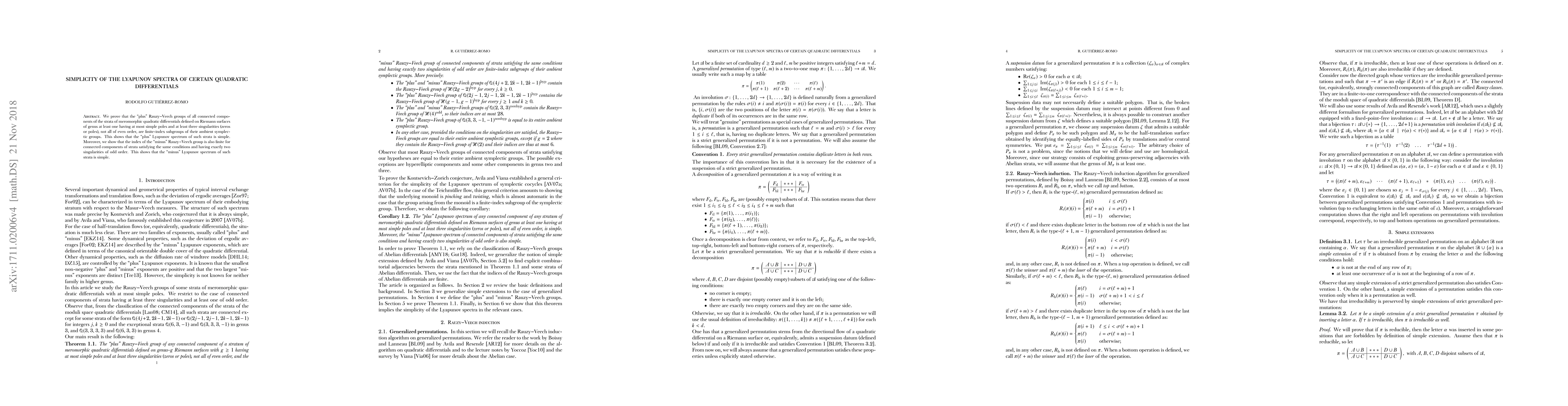 This paper demonstrates that the "plus" Lyapunov spectrum for connected components of strata of certain meromorphic quadratic differentials is simple due to the finite-index nature of their "plus" Rauzy--Veech groups. Additionally, it shows that the "minus" Lyapunov spectrum is also simple for components with specific conditions involving singularities.