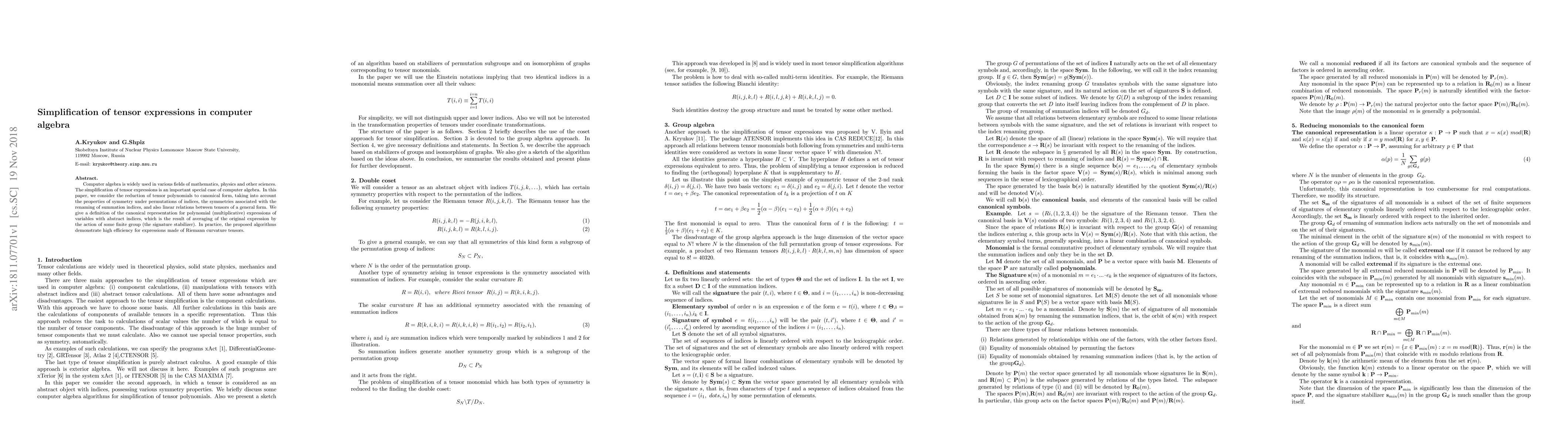 This paper presents algorithms for simplifying tensor expressions in computer algebra by reducing tensor polynomials to canonical forms, leveraging symmetry properties and linear relations. The proposed canonical representation method effectively handles tensors like Riemann curvature tensors with high efficiency.